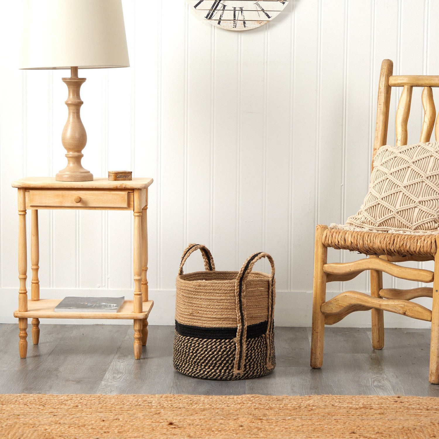 If you're looking for a cute, trendy accent to house your favorite faux-bulous plant, or a little extra storage, this jute basket is perfect. Handmade by artisans for long lasting use, feel authentic and natural, especially if you enjoy an earthy palette, the darker shade in the bottom, adds a rustic touch. For easy storing, this basket has two handles on each side. Standing 14", add to any area in need of some texture and color. House pot sizes with a width less than 13". Has no drainage holes