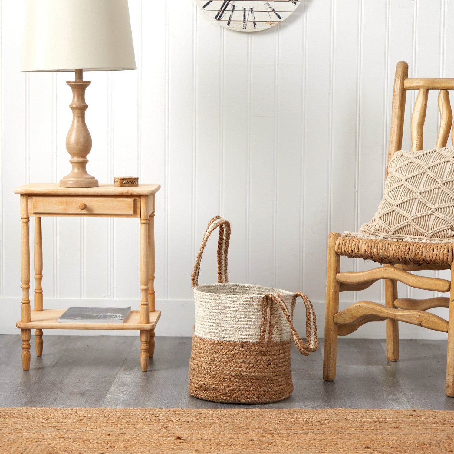 If you're looking for a cute, trendy accent to house your favorite faux-bulous plant, or a little extra storage, this jute basket is perfect. Handmade by artisans for long lasting use, feel authentic and natural, especially if you enjoy an earthy palette, the darker shade in the bottom, adds a rustic touch. For easy storing, this basket has two handles on each side. Standing 14", add to any area in need of some texture and color. House pot sizes with a width less than 13". Has no drainage holes