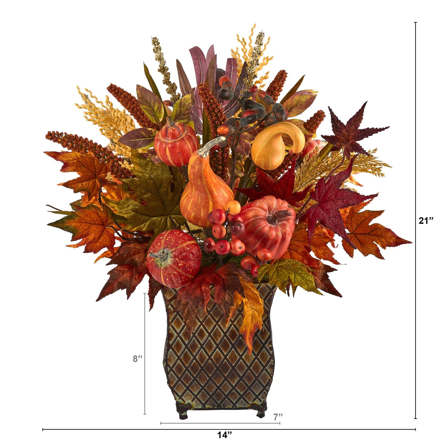 What’s better than pumpkin, maple leaves, and sorghum during harvest nights? This always ripe fall-inspired arrangement - a nestled bevy of fun autumn favorites that’ll delight your guests during your next dinner party or book club meeting. With its naturally occurring details, warm palette, and texture, this makes the perfect addition to any autumn décor. Standing 21" from a metal planter, gift to a teacher, co-worker, or friend.