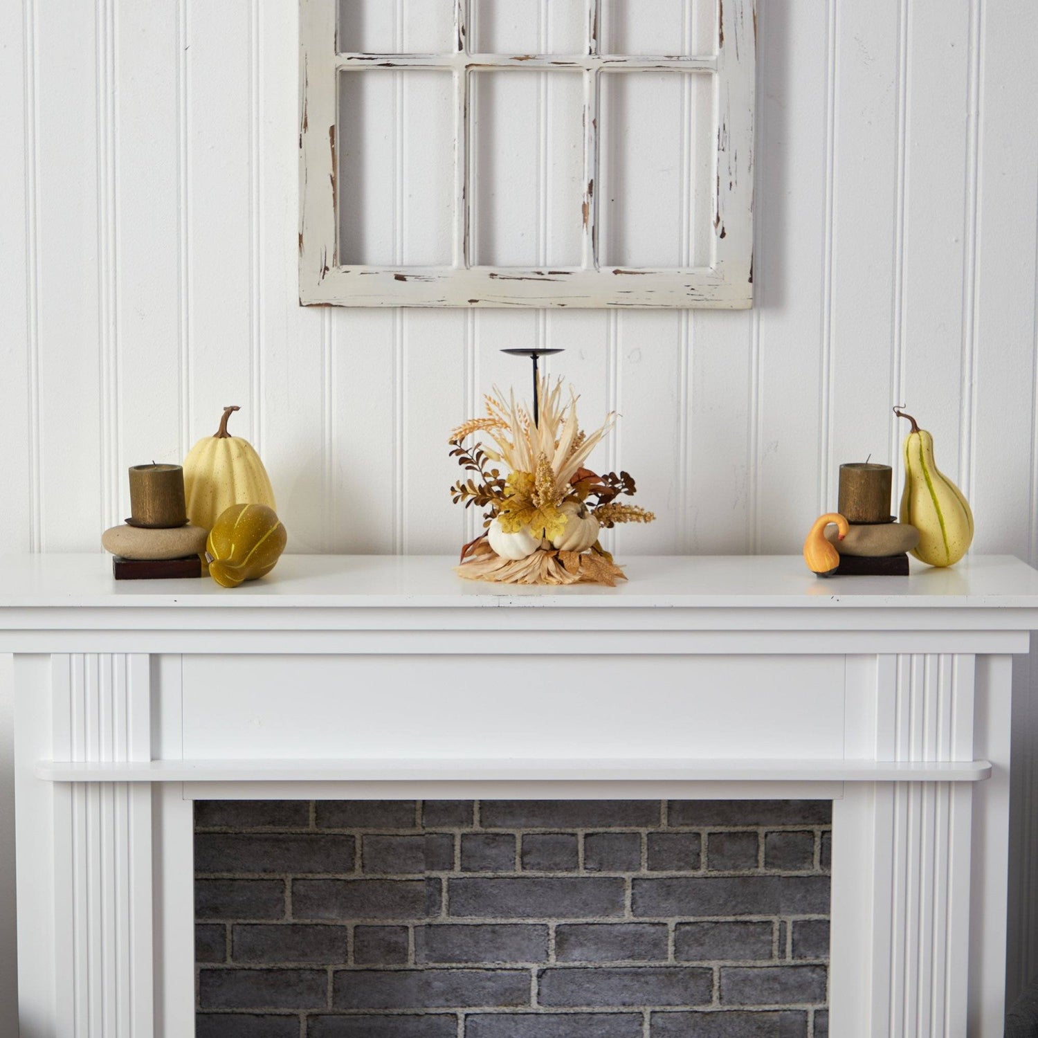 Set the scene during Thanksgiving with an Autumn Harvest and Pumpkin Candle Holder. For those cozy nights in, feel a little warmer by lighting your favorite candle and create an intimate setting, similar to a restaurant. Inspired by nature, harvest favorites such as fall foliage inspired maple leaves and wheat grass accent the pumpkins. With a height of 12", add to any table that needs a little light. Perfect during the fall months.