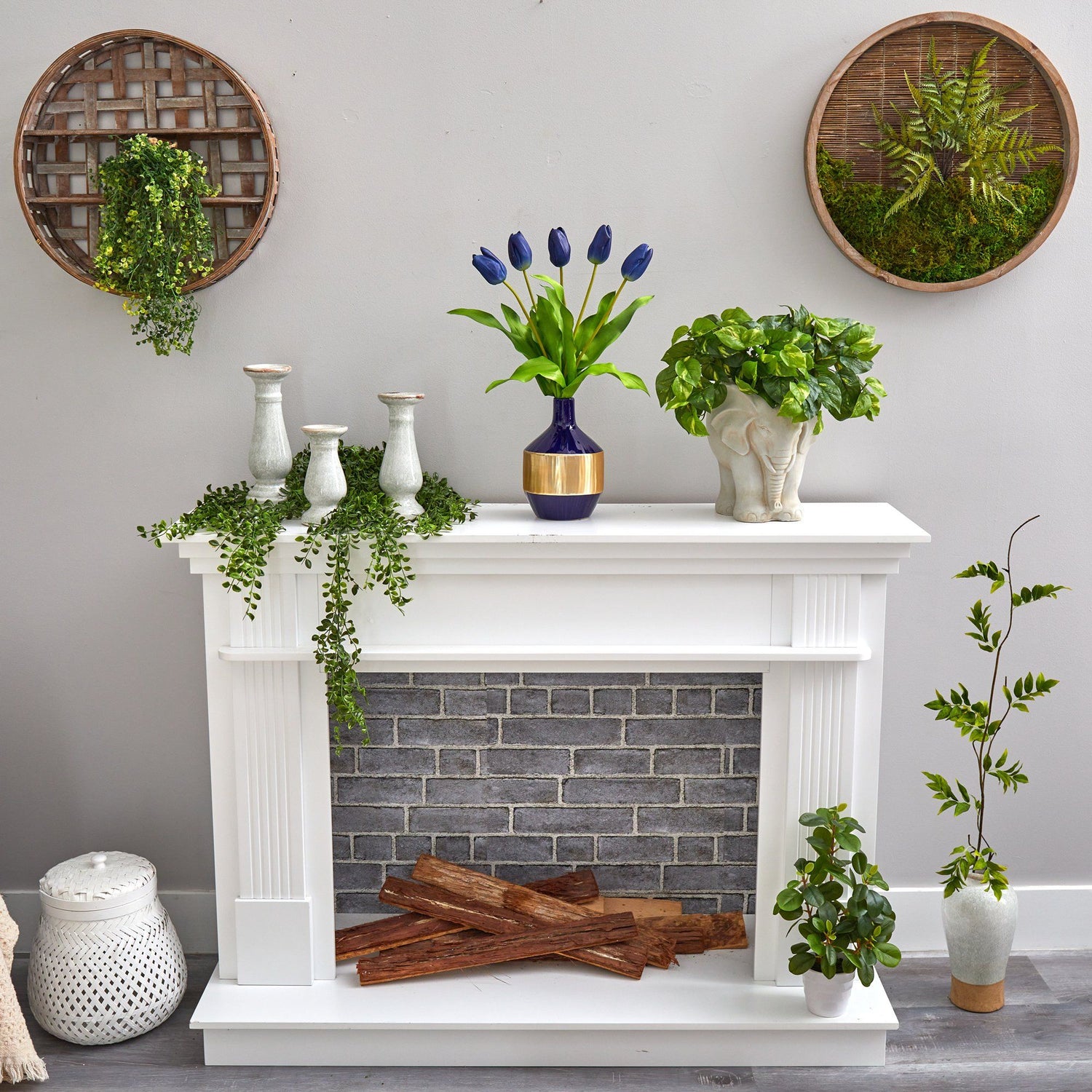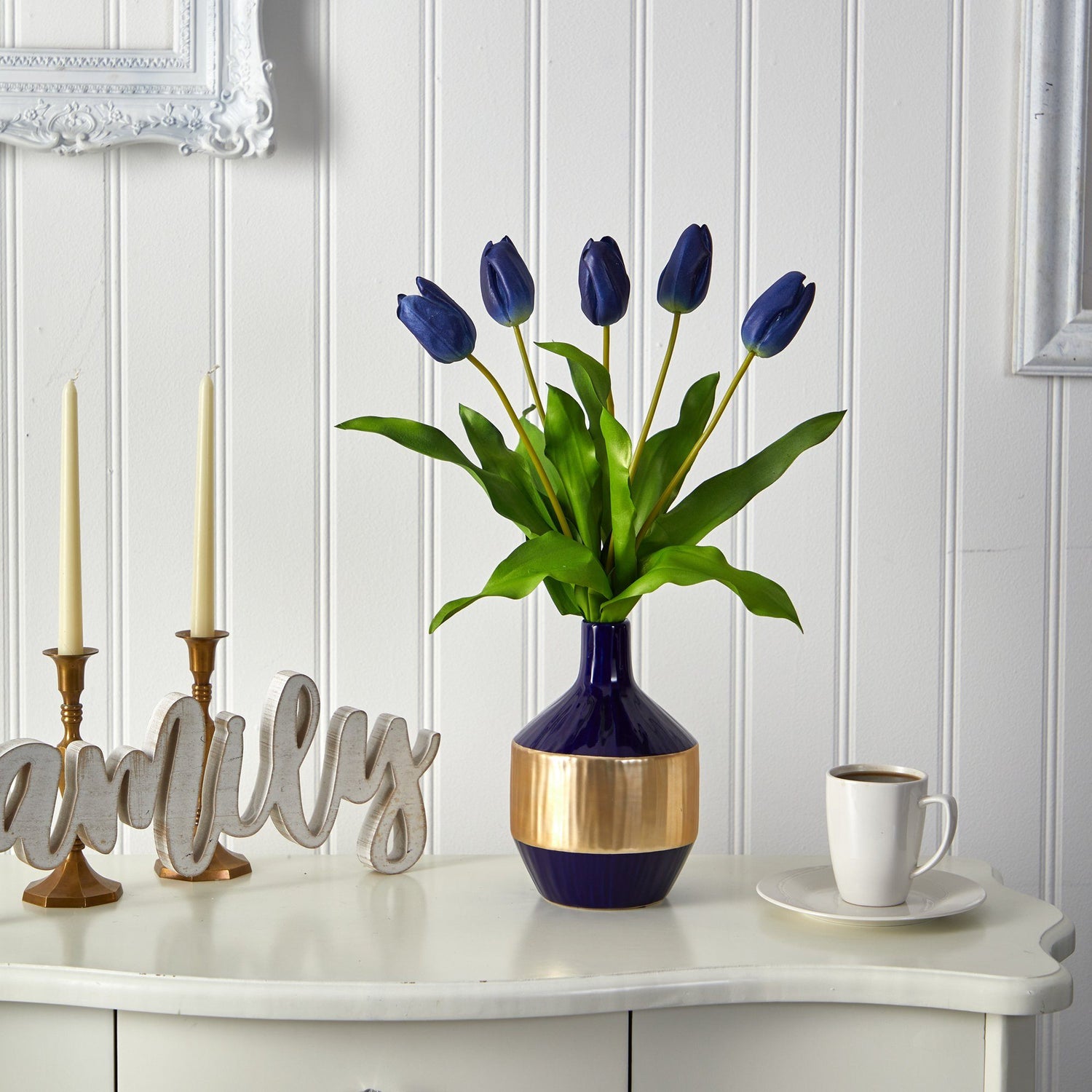 A symbol of spring, you can now enjoy the Tulip's warmth all year long with this Dutch Tulip Artificial Arrangement. A bunch of Tulip flowers not yet in bloom, are accented by green leaves to bring texture, drama and color to spaces in need of a spring awakening. Experience the fresh from the garden feel every season effortlessly without the need for maintenance. Standing 22" from a blue and gold designer vase (included in height), gift as a present. Perfect for offices, mantels, kitchens, bedrooms or kitchen nooks.