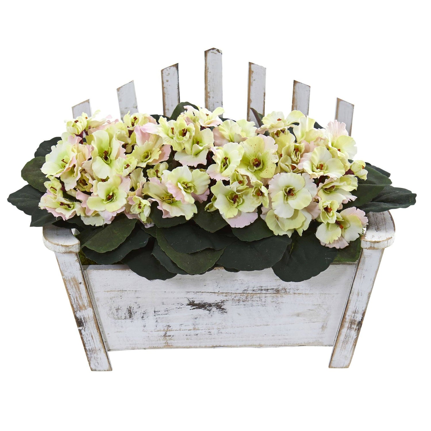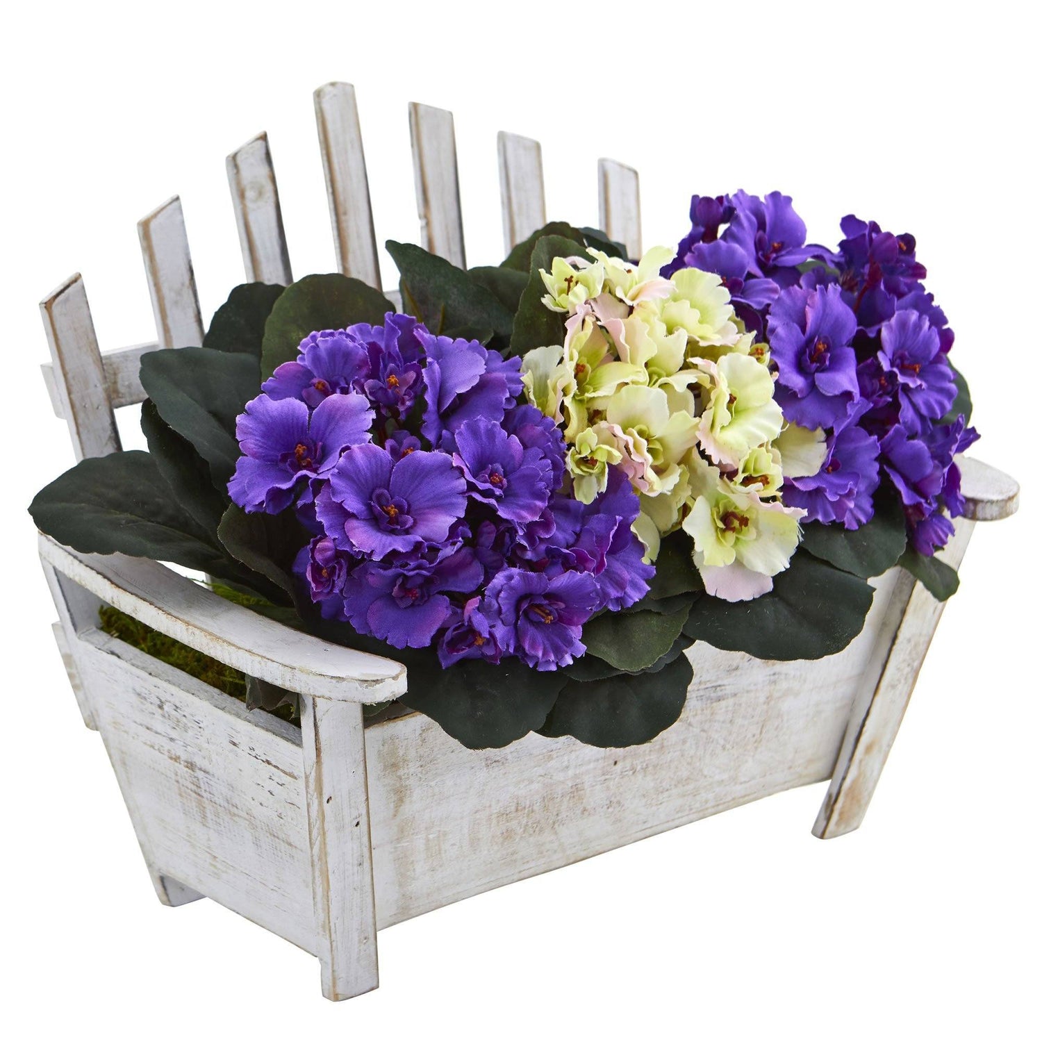 This whimsical arrangement’s size makes it ideal for nearly any room in your house! The playful arrangement features artificial African violets in a bench planter. Bring the organized chaos of the garden shed indoors without the mess!