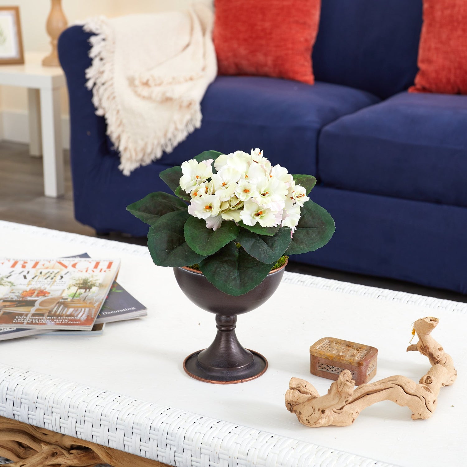 Add hints of color throughout everyday interiors with this artificial plant showcasing a bright overgrowth of intricately designed African Violet blossoms, handsomely contrasted with dark, lifelike leaves popping out from underneath. Standing 11” tall from a metal chalice, this artificial plant would easily brighten a bare space in your home or office without the need for maintenance.