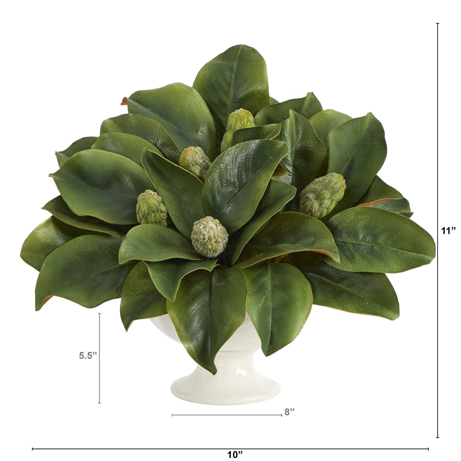 Add a sense of natural freshness throughout everyday spaces with this artificial plant boasting an overgrowth of forever-green magnolia foliage, delicately accented with flowering buds to-be. Incredibly lifelike and perfect for year-round display, this handsome fake plant stands 11” high from its white pedestal planter.