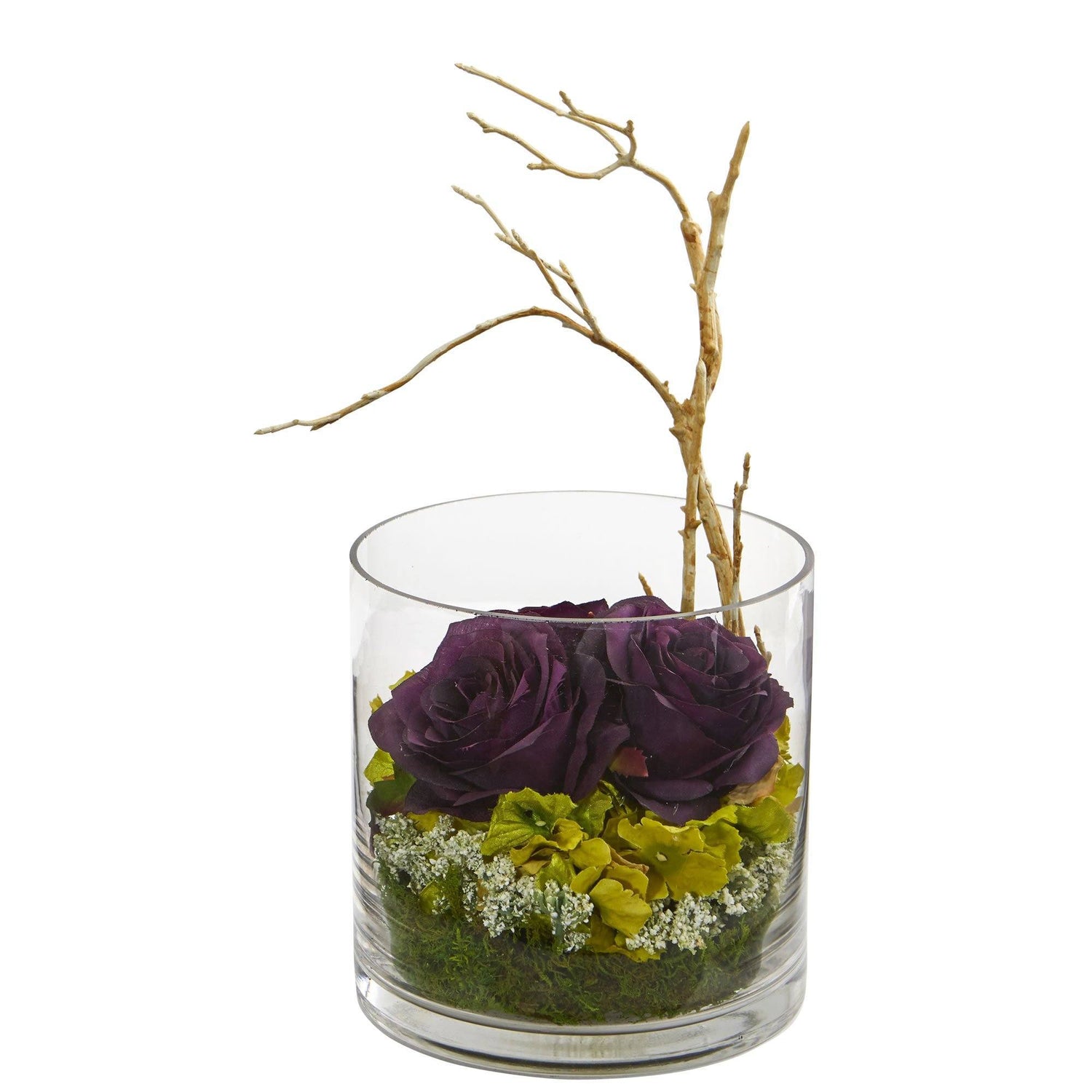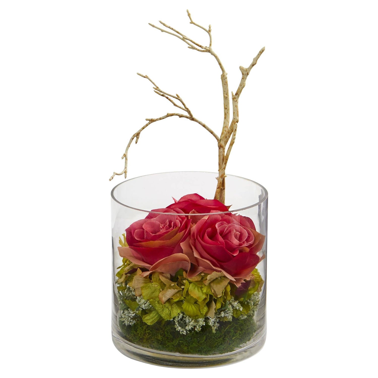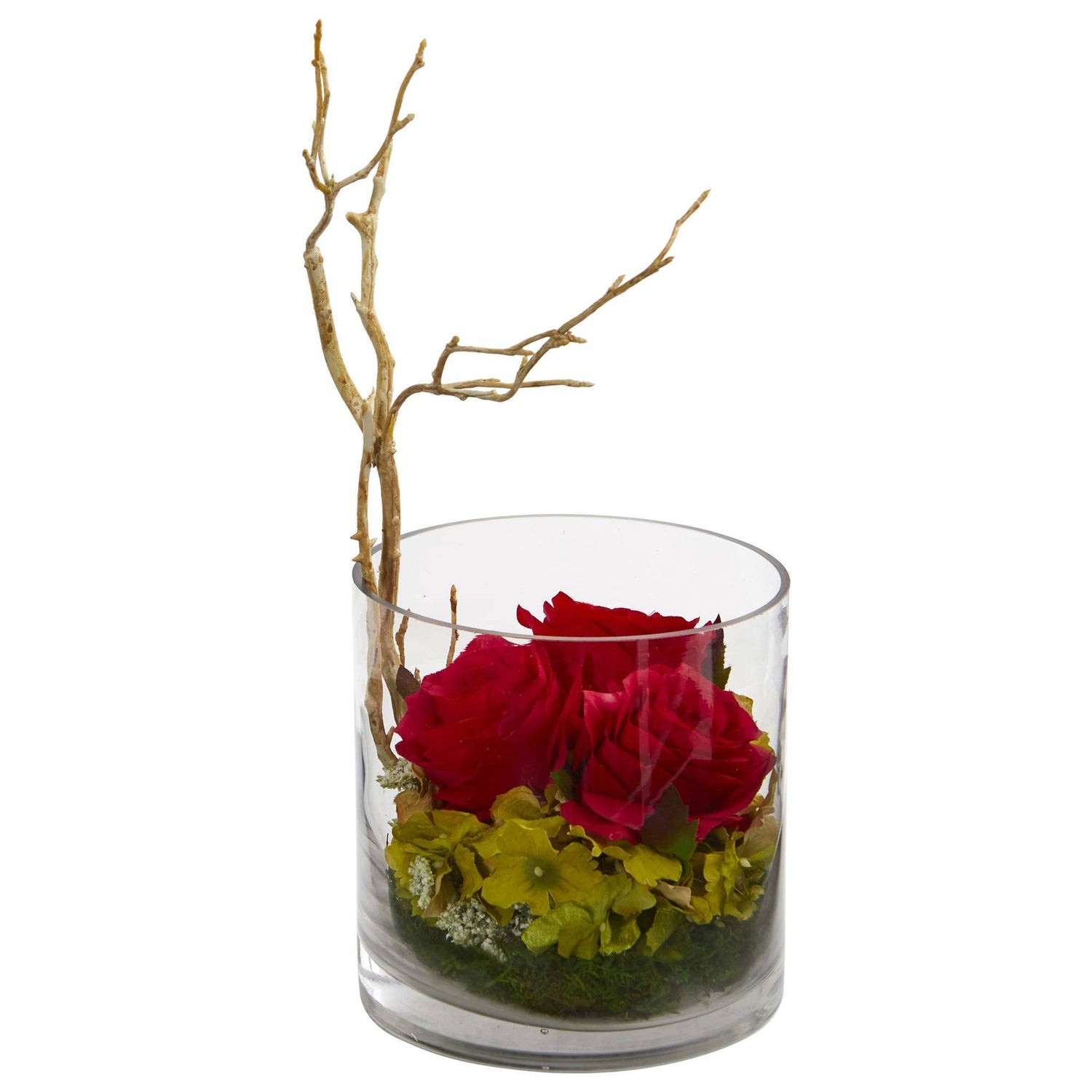 The vibrantly-colored blooms in this artificial roses and hydrangeas arrangement are sure to catch the eye. It features an interesting arrangement of fresh-looking rose petals on top and an ample amount of delicate hydrangeas at the bottom, all brought together in the included clear round vase. The realistic leafless stem gives off an air of mystery and intrigue. It's perfect for a desktop or reception area or tucked next to a desk organizer.