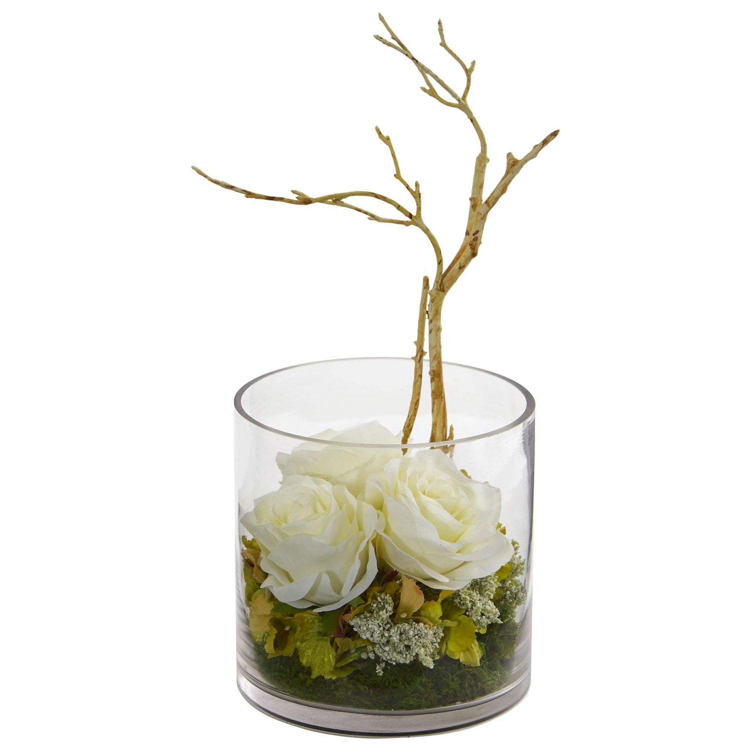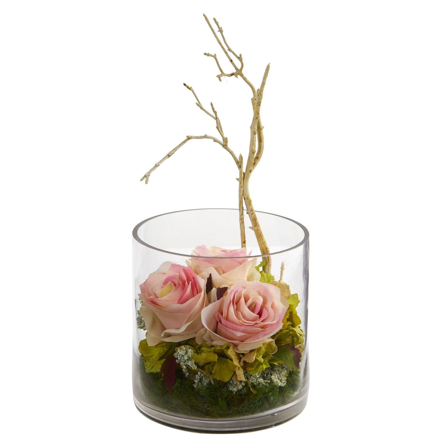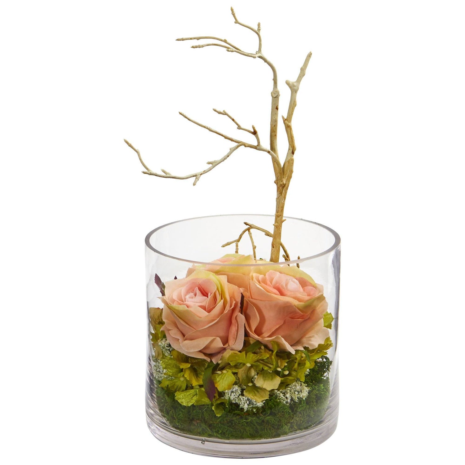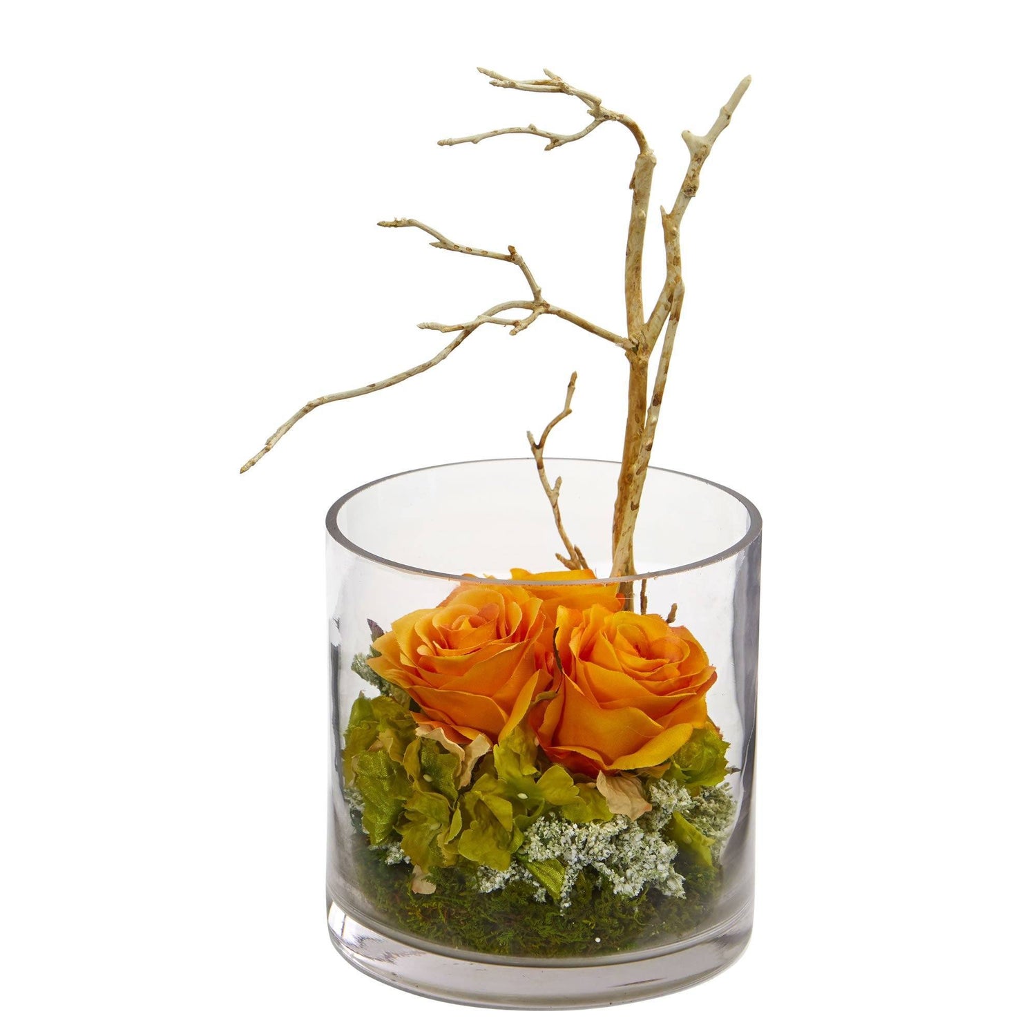 The vibrantly-colored blooms in this artificial roses and hydrangeas arrangement are sure to catch the eye. It features an interesting arrangement of fresh-looking rose petals on top and an ample amount of delicate hydrangeas at the bottom, all brought together in the included clear round vase. The realistic leafless stem gives off an air of mystery and intrigue. It's perfect for a desktop or reception area or tucked next to a desk organizer.
