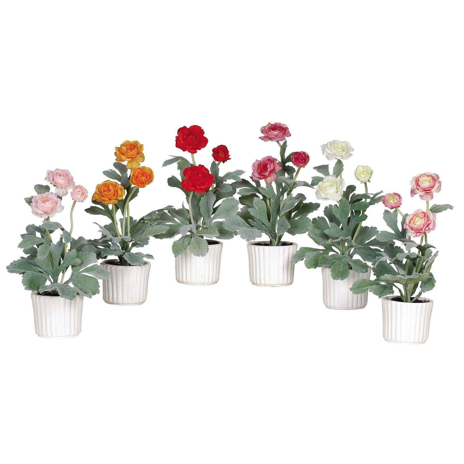 While their name might not seem very eye-catching, these beautiful Ranunculi are sure to please even the most discerning critics. Bold bursting blooms perched on a trio of long slender stems make these flowers the focal point of any room they grace. A cluster of elongated green foliage surrounds three multi-colored petals. A sleek yet simple white ceramic vase adds a nice finishing touch.