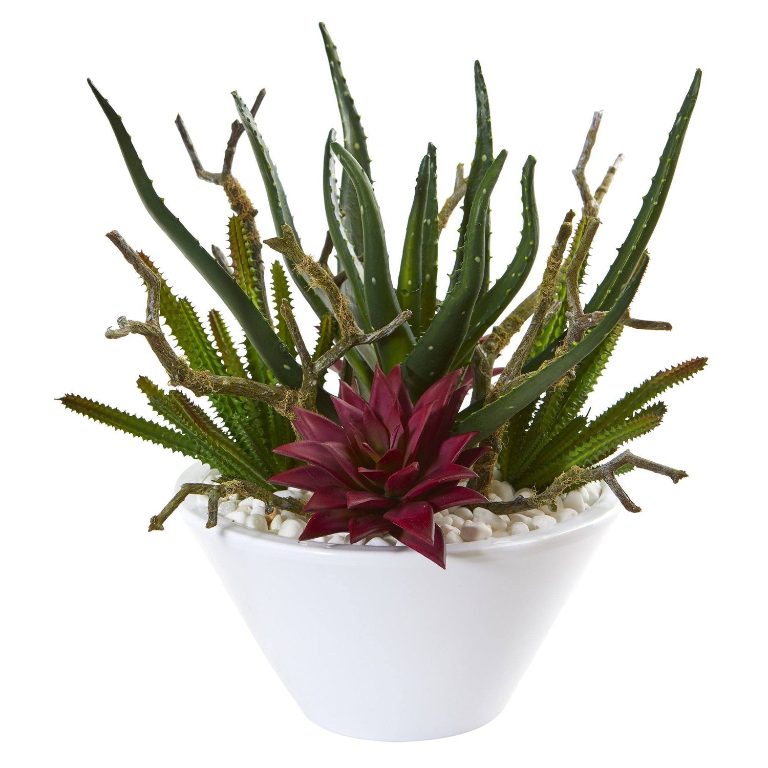Incorporate realistic foliage throughout everyday spaces with this artificial garden of mixed succulents; boasting various kinds, this faux-living garden features a collection of lifelike replicas that admires will have a hard time believing isn’t real. Standing 13” tall from a white bowl nestled with white rocks, this fake plant is great for bare, empty spaces.
