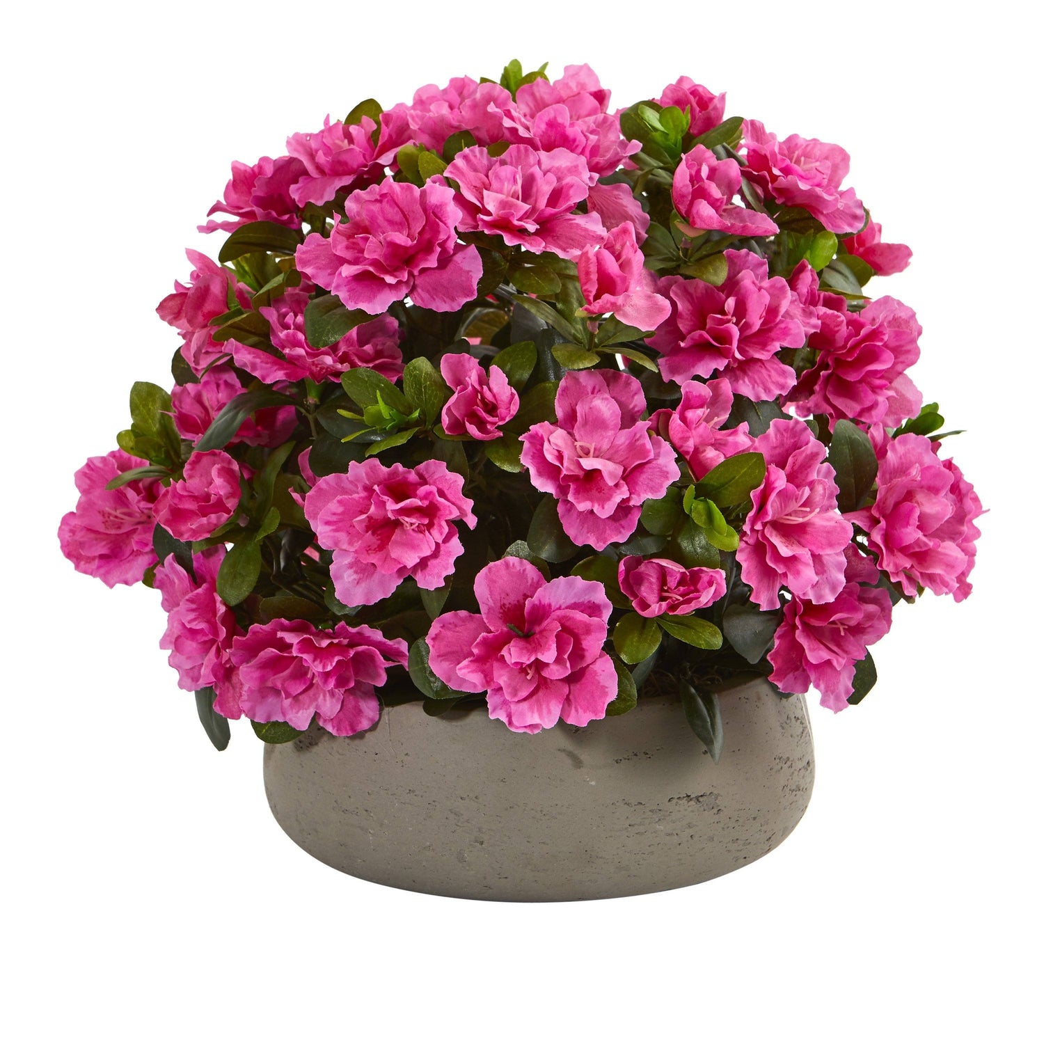 A pink-lovers dream, the artificial azalea’s light coloring will soften the atmosphere in any room. Playful and whimsical, the ample amount of stunning bright pink blossoms nearly obscures the green foliage that sits behind it. Situated in a stone planter, this artificial azalea plant can be used to accent a bedroom’s vanity, dresser, or end table with white picture frames, containers, and other room décor.