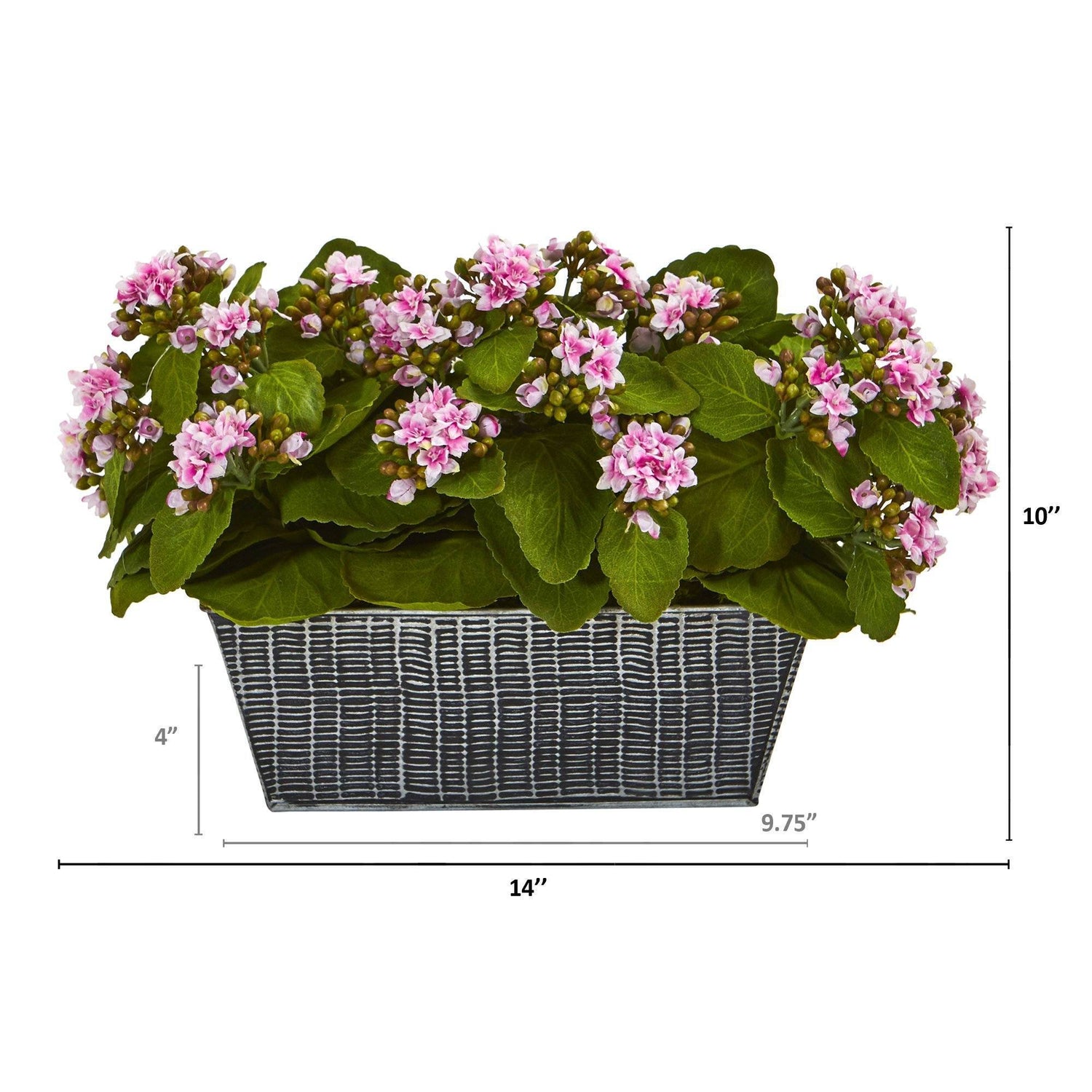 Brighten everyday spaces with the help of this artificial plant showcasing an overgrowth of kalanchoe blossoms in bright, vivid colors, handsomely contrasted with dark green foliage. Nestled in an embossed black tin planter with natural moss, this 14” wide silk plant would easily freshen up bare windowsills and counter spaces.