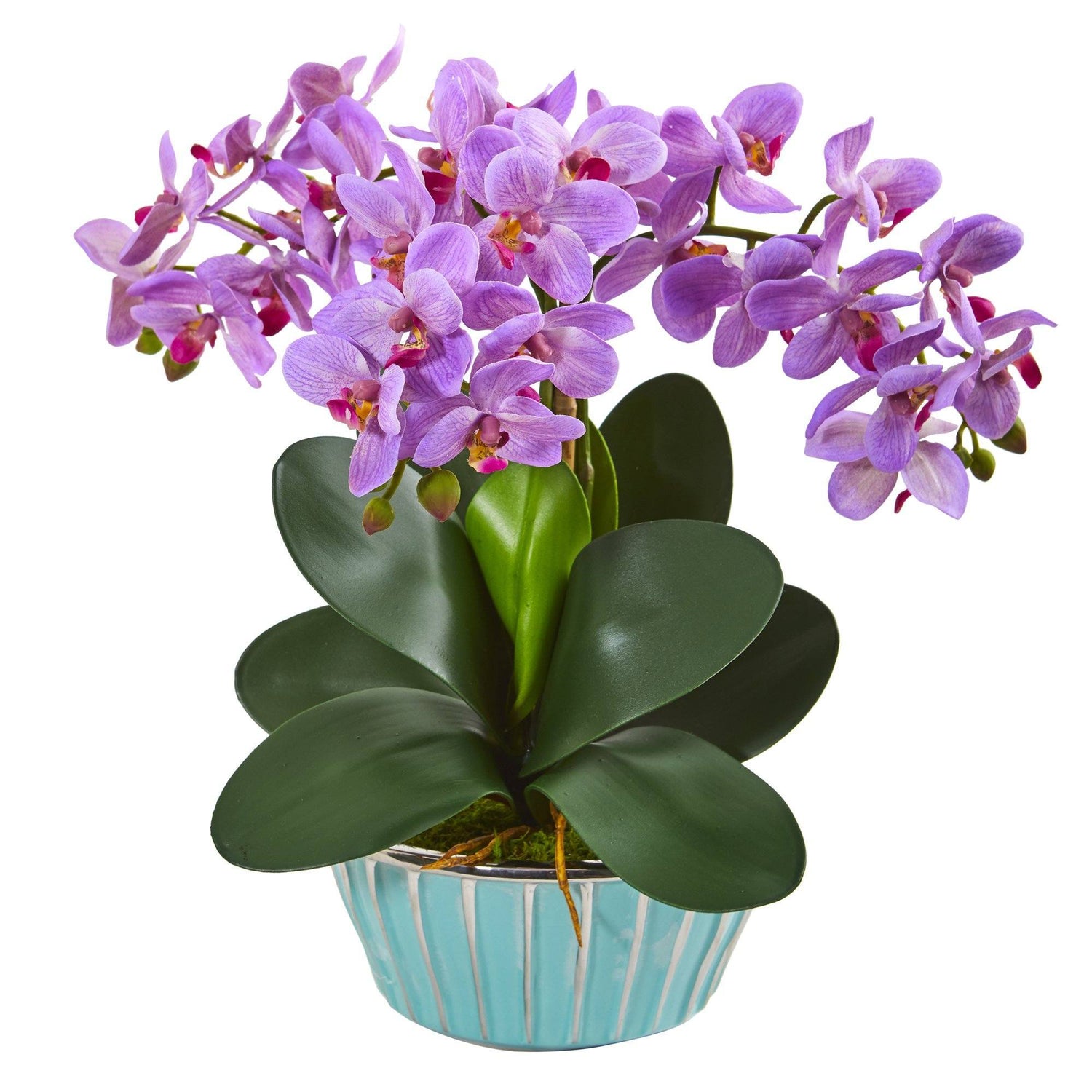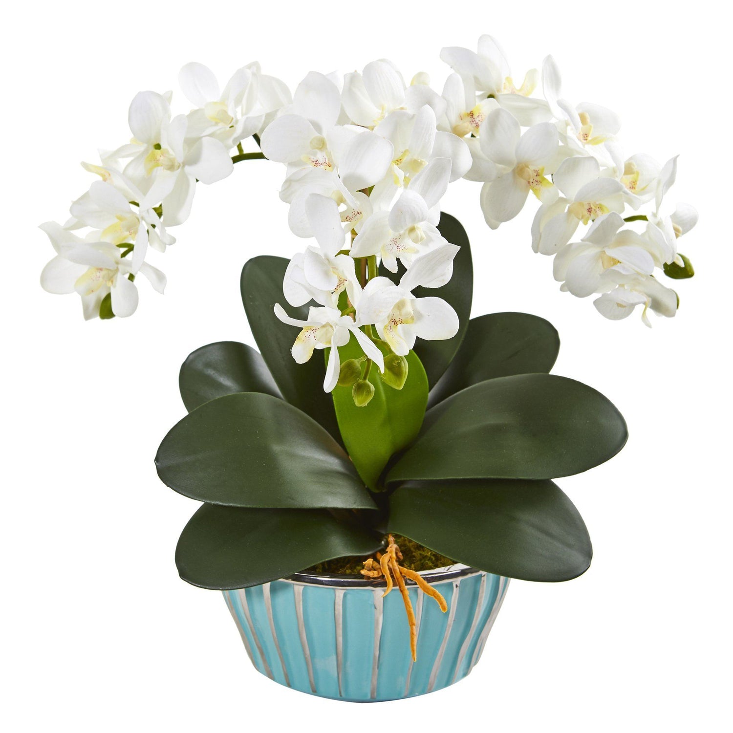 Flaunt natural beauty year round with this arrangement of artificial phalaenopsis orchids boasting vibrant, soft blooms from sturdy stems and nestled with natural moss. Reaching 14” high from a turquoise vase, this gorgeous arrangement would instantly brighten a home office or reception space.