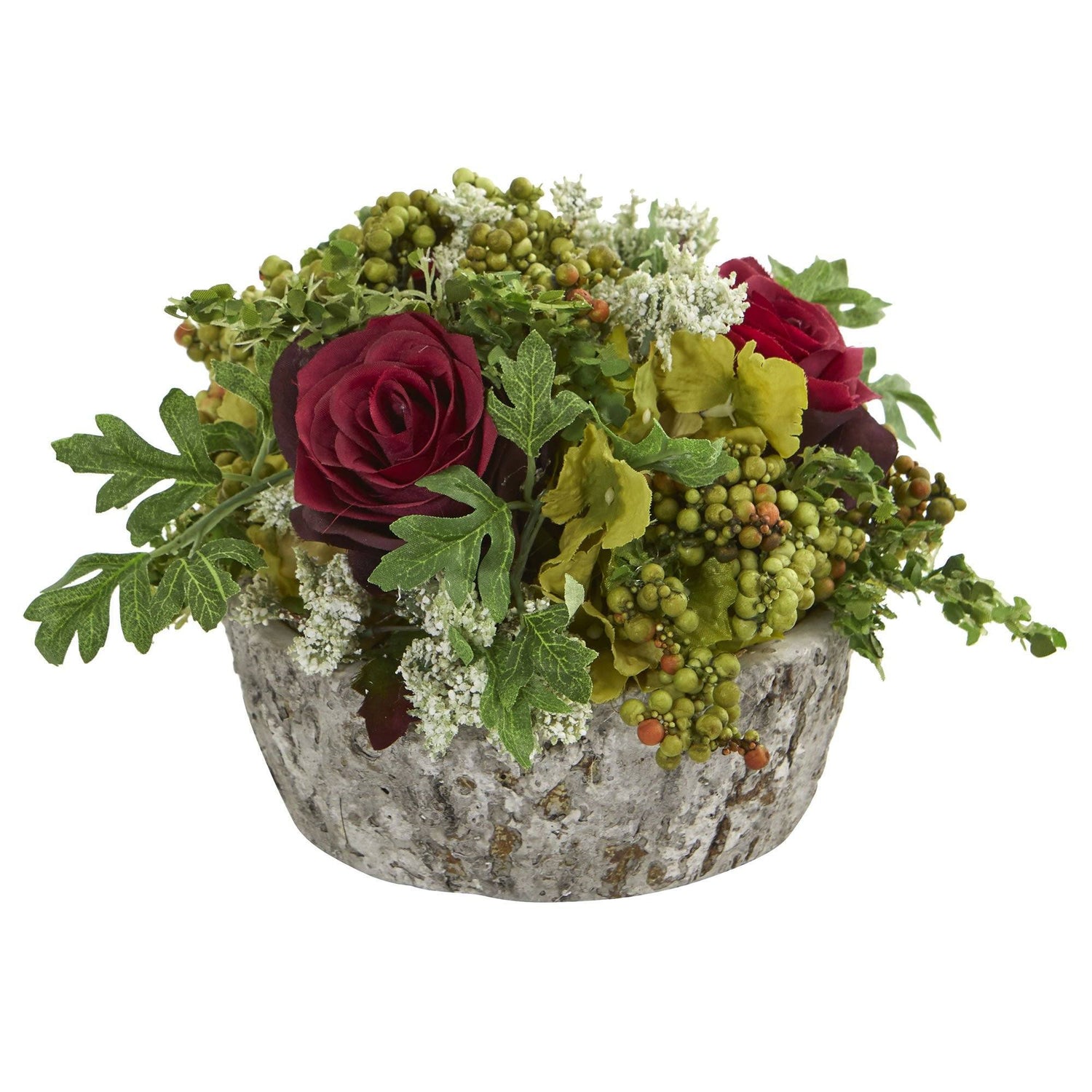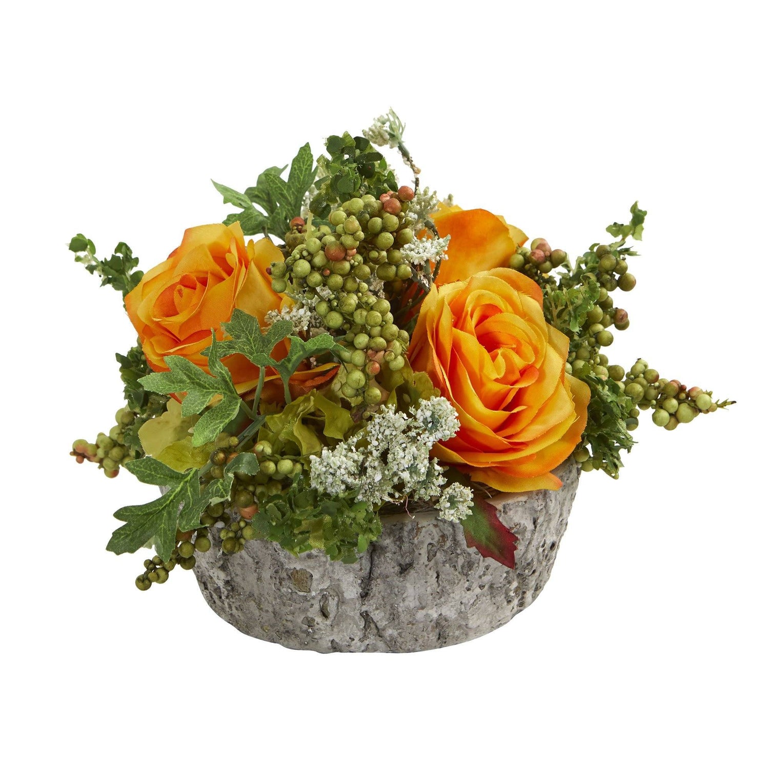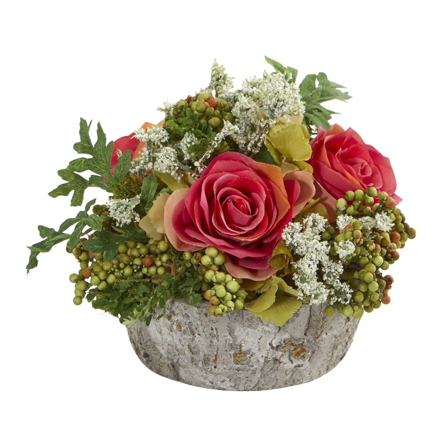Bursting with bright colors, this artificial roses bouquet arrangement has a variety of vibrant blooms, rich, realistic berries, and leaves overflowing from an included oak vase. Use it to add color and character to a hall table with a patterned runner underneath, or include tea lights to highlight the beauty of this 7-inch artificial roses bouquet arrangement.