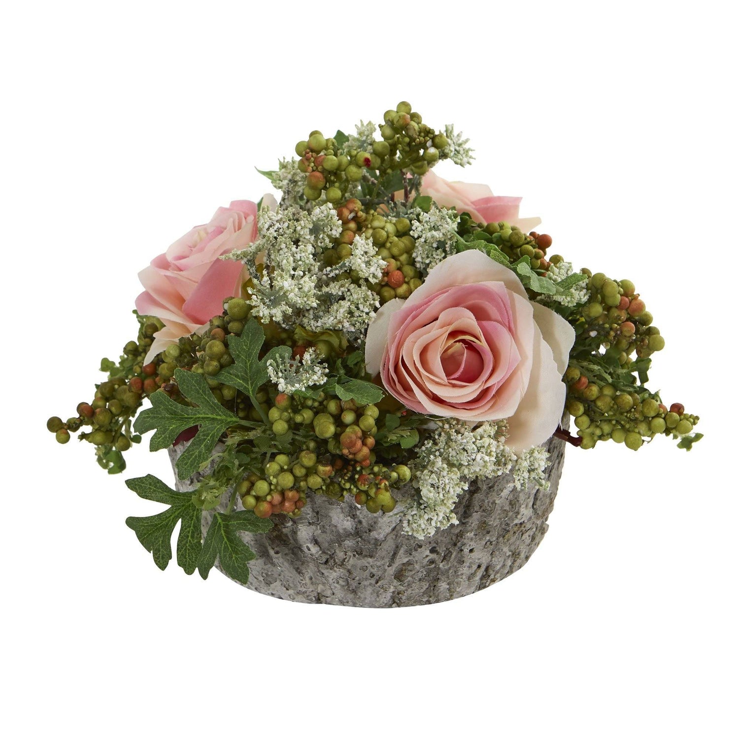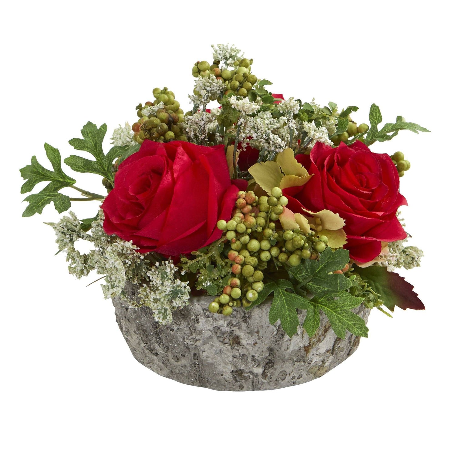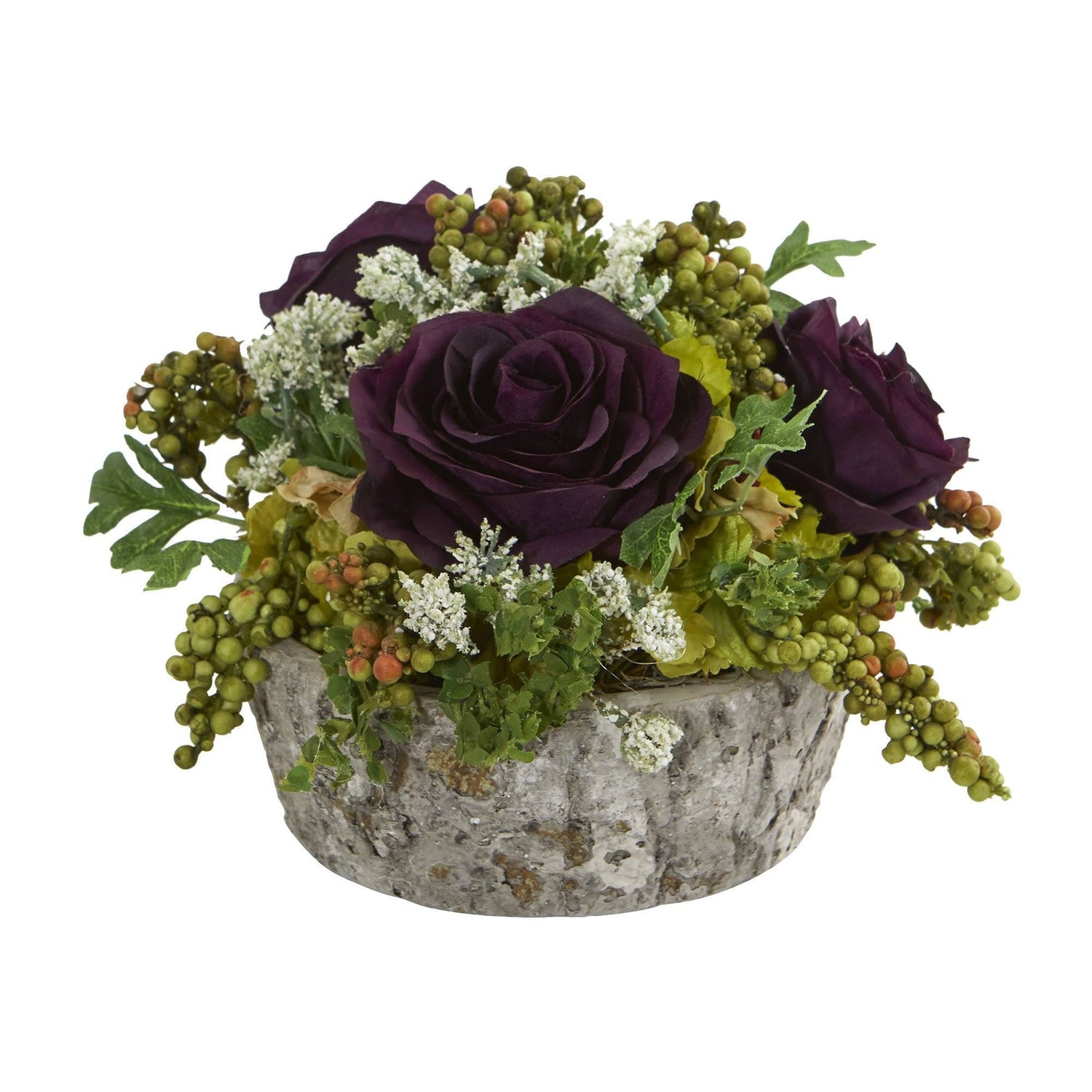 Bursting with bright colors, this artificial roses bouquet arrangement has a variety of vibrant blooms, rich, realistic berries, and leaves overflowing from an included oak vase. Use it to add color and character to a hall table with a patterned runner underneath, or include tea lights to highlight the beauty of this 7-inch artificial roses bouquet arrangement.