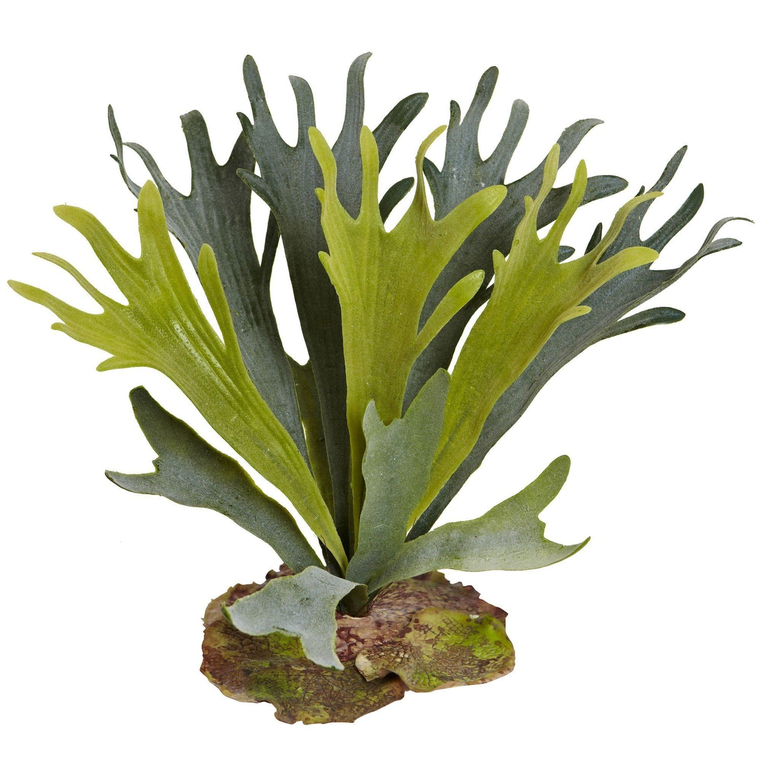 Natural and unique in appearance, this 14-inch staghorn artificial plant features several long wavy shaped fronds in various shades of green that extend upward. Small in size, it comes in a set of six. Place these pieces together on a sofa table in a sun room alongside other artificial ferns and flowering plants to recreate a beautiful tropical feel in your home.