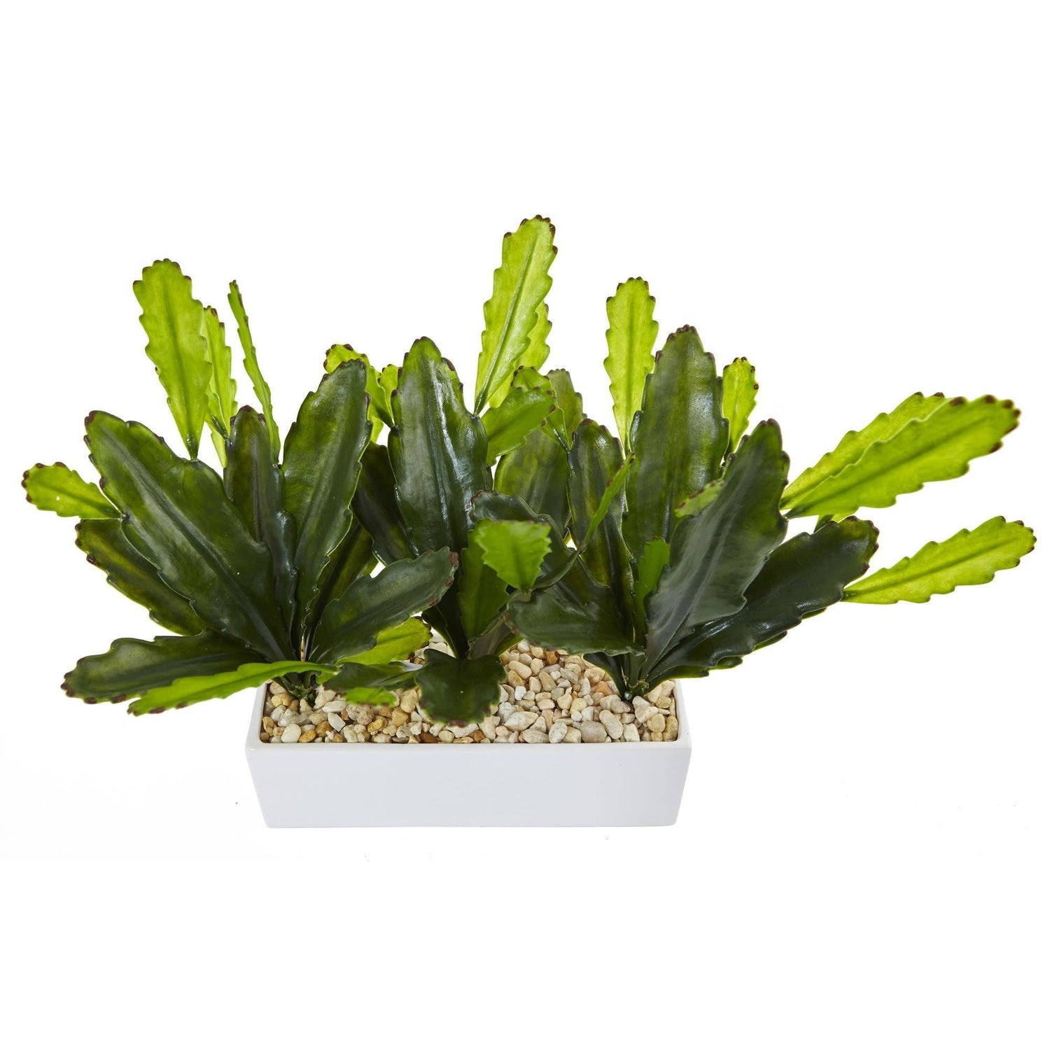 Sprouting tall in a modern white planter, three bundles of cactus leaves give a pop of simple greenery to the home. Varying leaf heights and adjustable stems make for a realistic appearance. Place the new age faux botanical atop the desk or side table for simple, year-round color. Includes river rock filler.