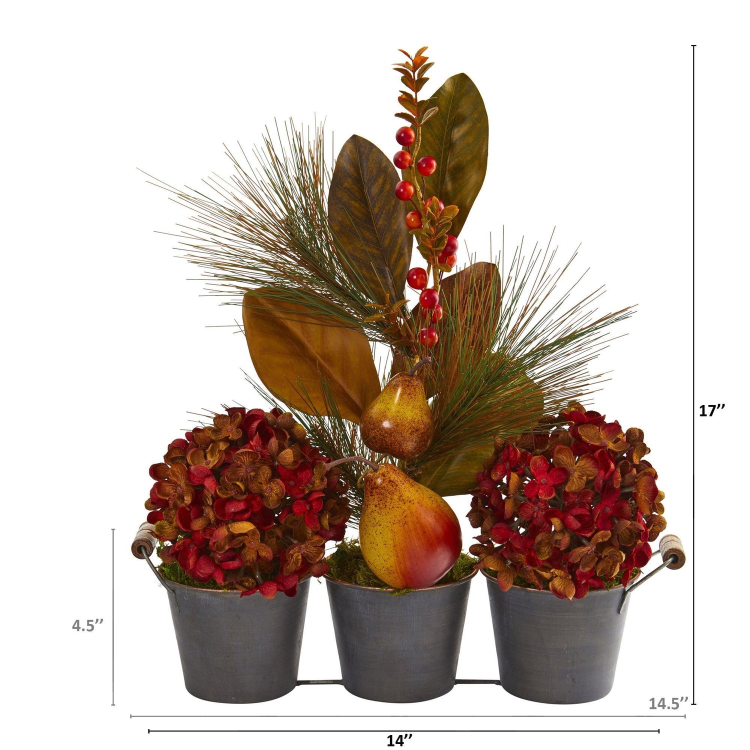 Update seasonal decor throughout your home with the help of this artificial arrangement; boasting autumn-inspired silk hydrangeas, handsomely complemented with various magnolia leaves in dusty tones, and accented throughout with realistic looking pears, berries, and pine greenery. Standing 17” high from a trio metal vase, this fake arrangement would create an attractive-looking focal point wherever displayed.