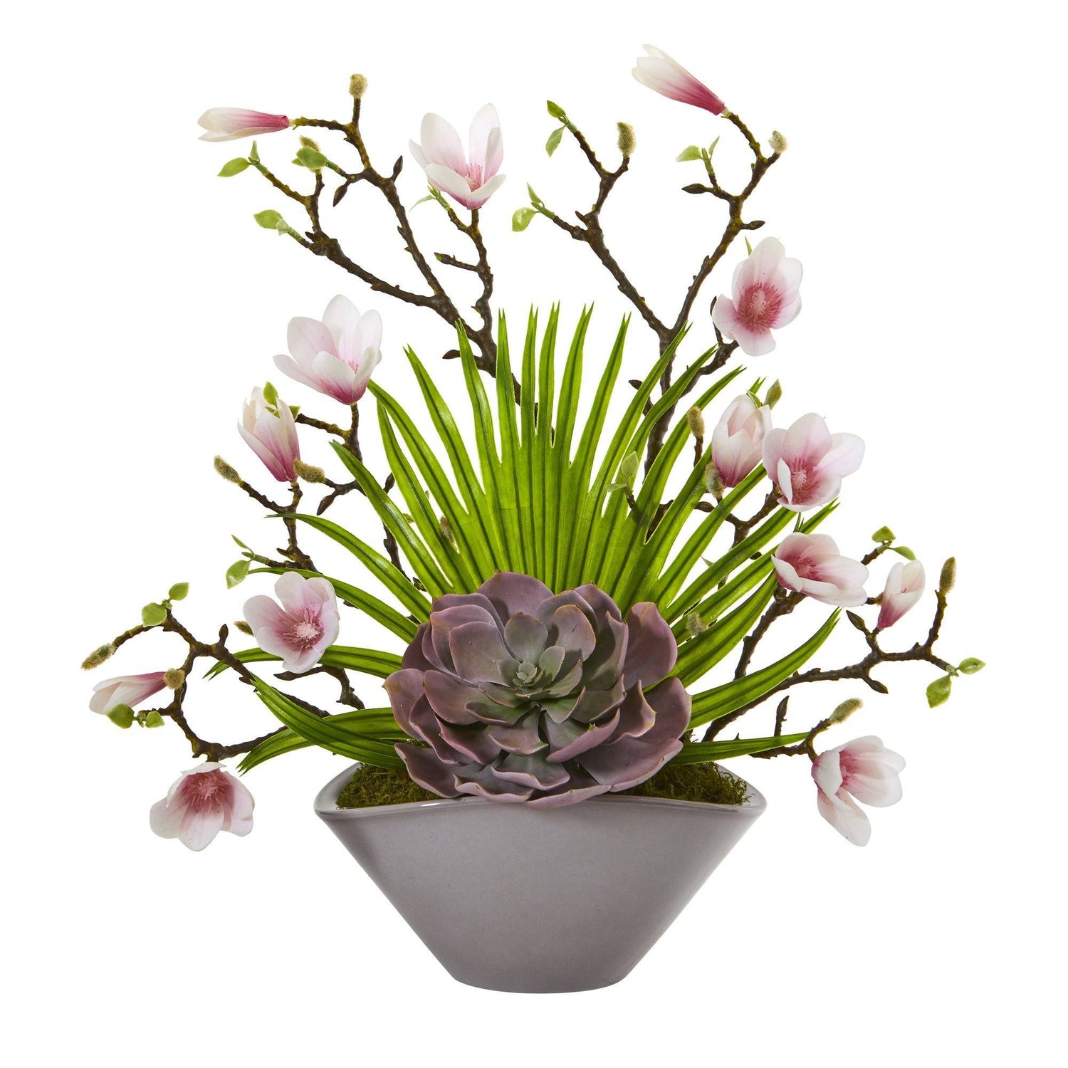 Create an instant focal point with the help of this artificial arrangement boasting various magnolia branches, each detailed with lifelike greenery and intricately designed silk blossoms, frozen in mid-bloom. Handsomely nestled amid natural moss and accented at the base with a realistic succulent and palm greenery in vivid coloring, this artificial arrangement stands 18” high from its accompanying vase.