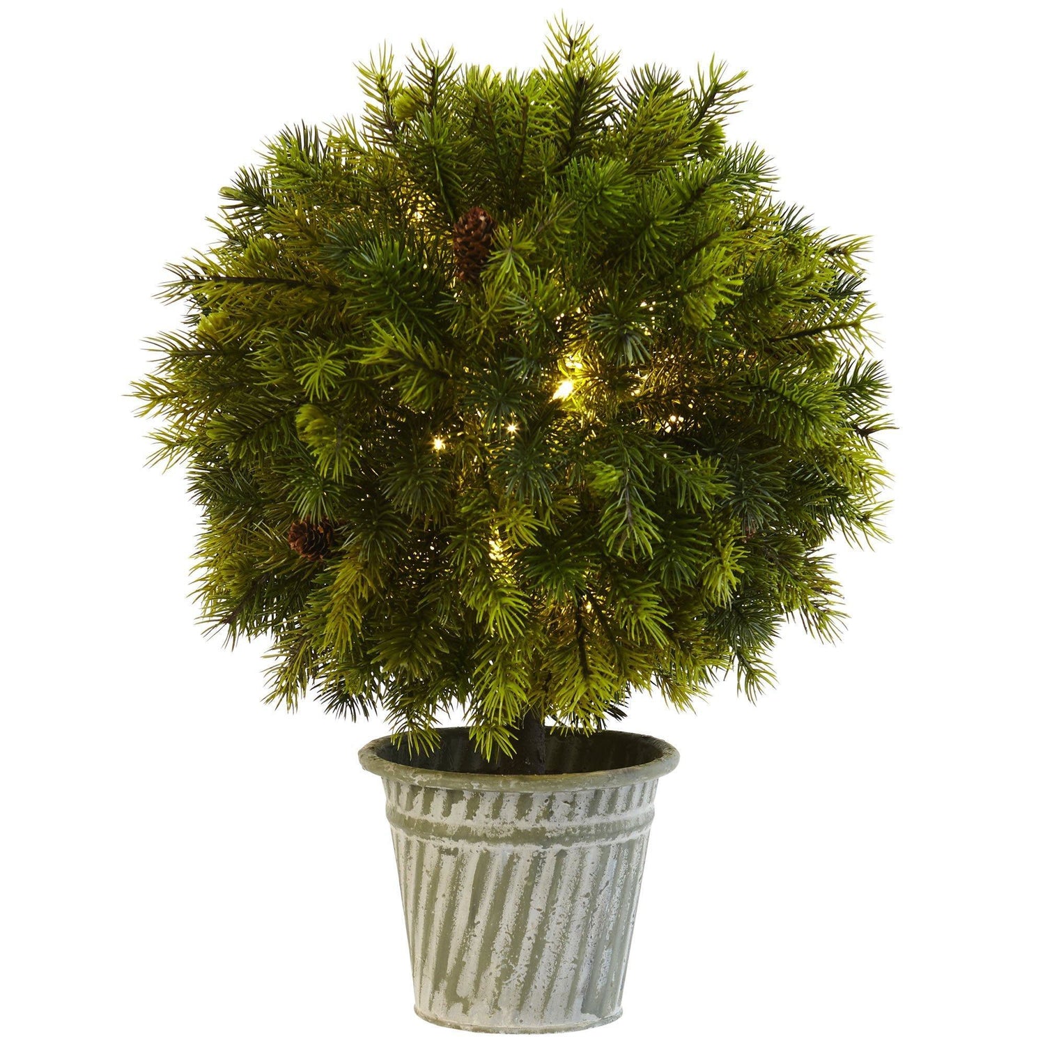 Create a light-up, winter wonderland display with a pine topiary arrangement. 18" tall and potted in a rustic iron pot, the faux pine arrangement adds a hint of vintage farmhouse appeal to a holiday home. Pine ball topiary includes 35, battery-operated LED Stay Bright lights.