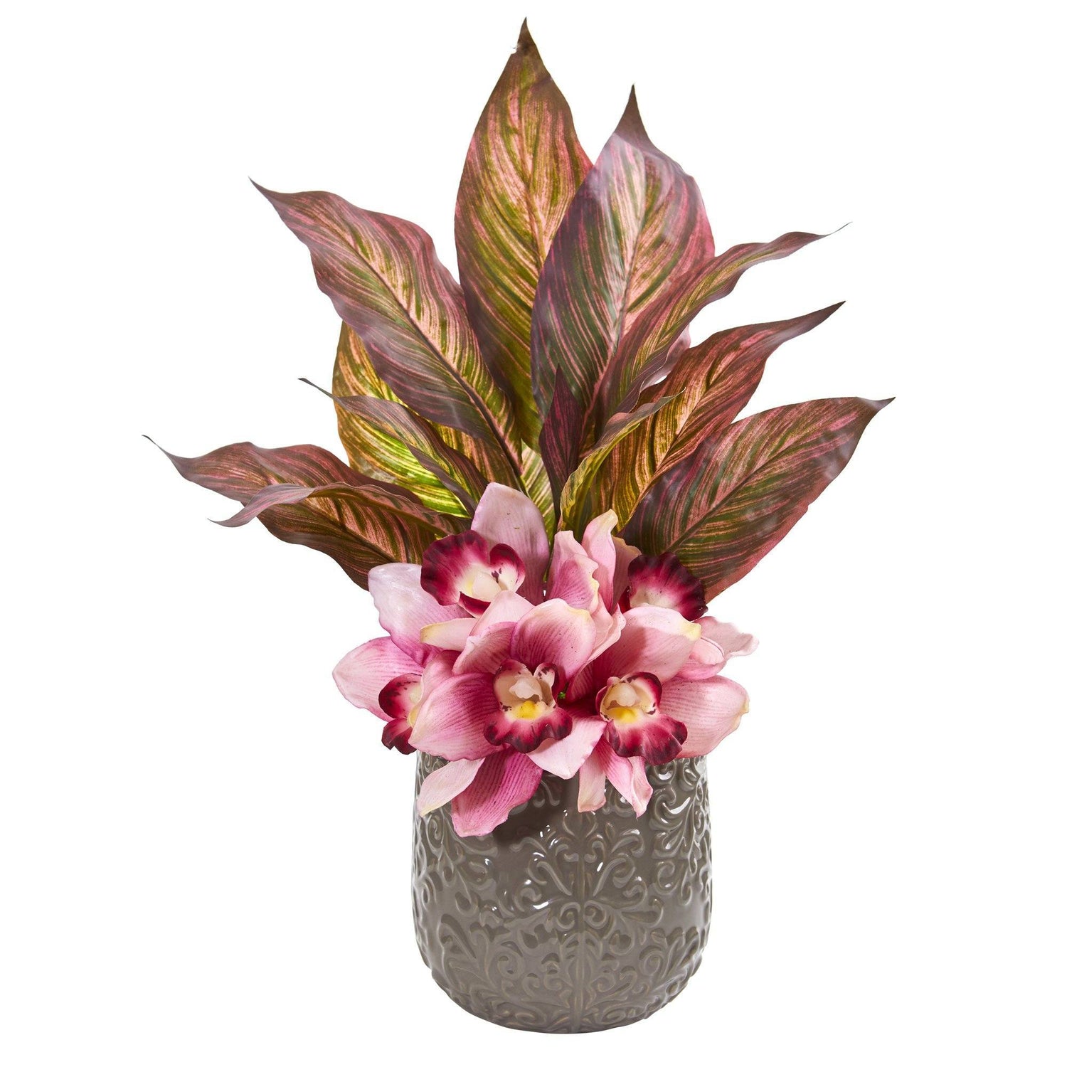 The beauty of the cymbidium orchid is brought to (faux) life in this artificial replica of the real thing. Pouring out from its container, this 19” arrangement proudly displays a mix of the orchid’s realistic blossoms, set against variegated musa leafs - so life like, guest will be baffled by the replica! Great for adding to a vibrant colored home, this lush piece would look beautiful displayed in an open dining room.