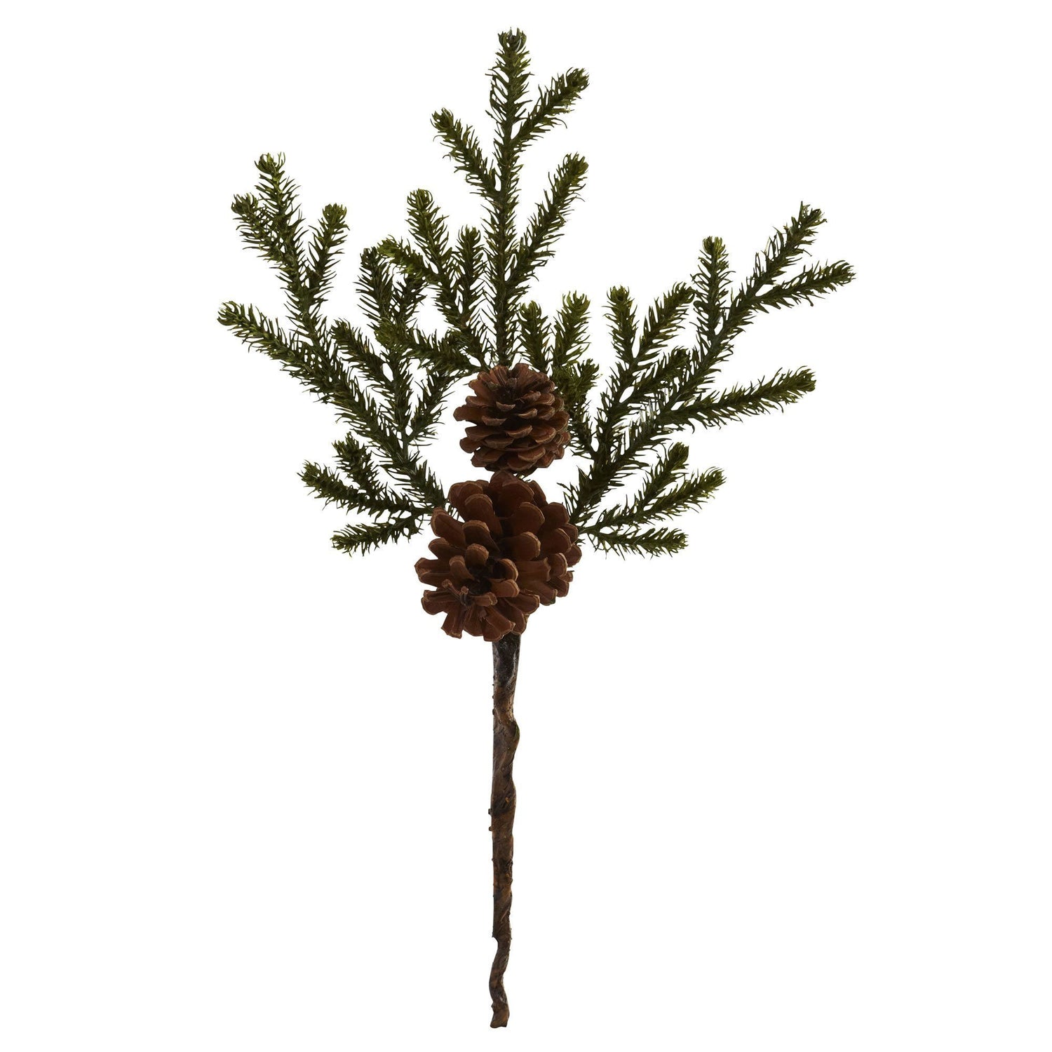 Standing at 19 inches, this artificial pine and pinecone set is truly an eye catcher! With two natural-looking pine cones that stand out among the surrounding green foliage, you can recreate the scenery of the woods inside the comfort of your home. Use it to spruce up your flower arrangement and decor with this set. It comes in a set of 12, so you can split them up and place them throughout a room.