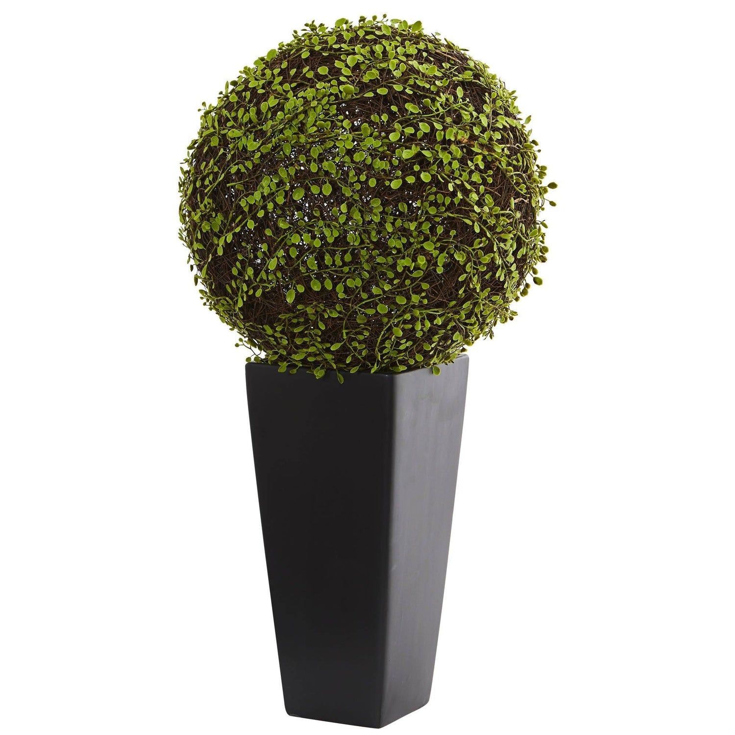 Impress your guests with this eye-catching, well-crafted sphere shaped artificial mohlenbechia ball plant. It comes in a black tower vase that can sit atop any table, counter, or desk with pride. Dark tones will provide a more toned down elegant look to any room.