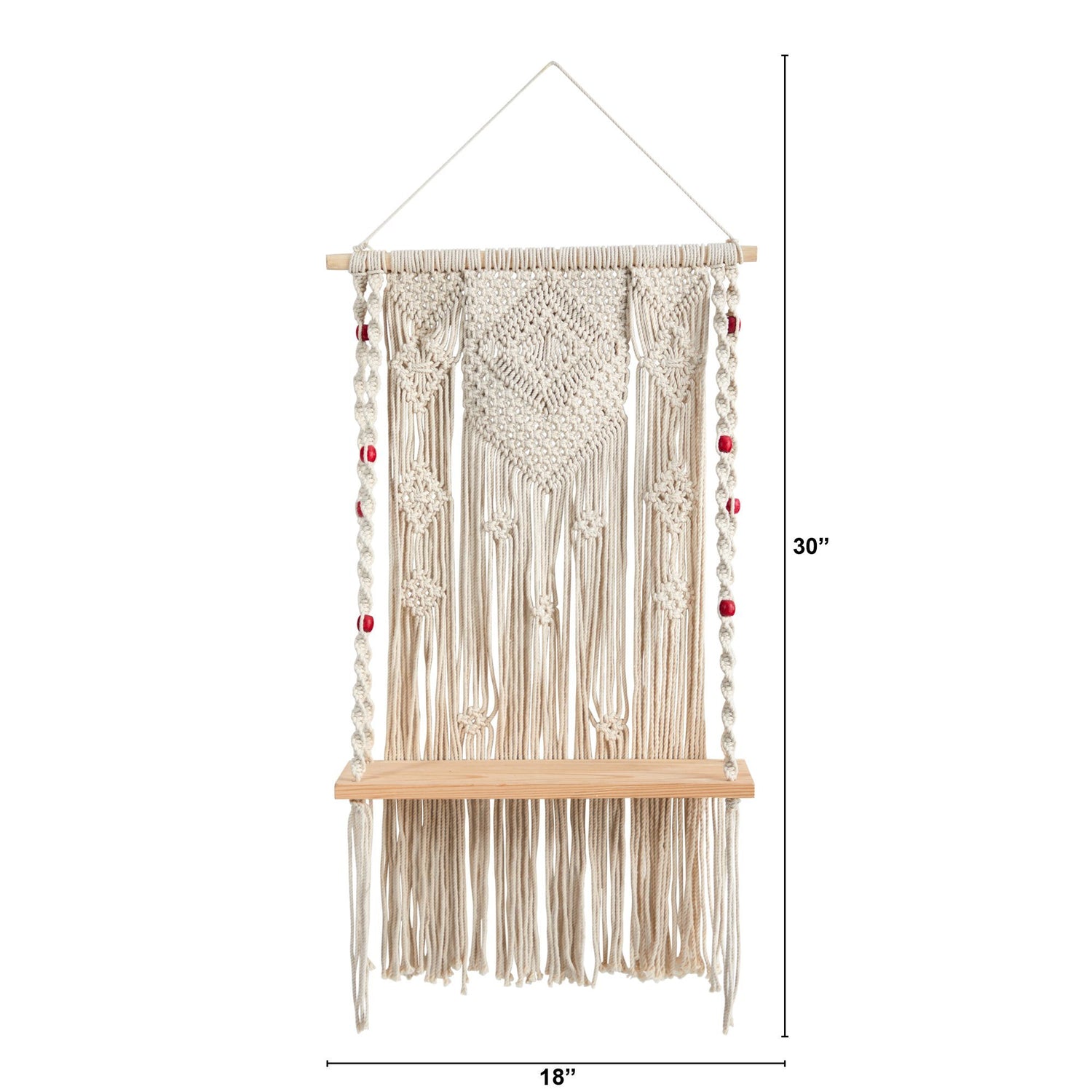 Make your boho dreams come true with this Handmade Macramé Wall Hanging Décor. Handcrafted from fine materials by artisans, the whimsical design contrasts with the rustic, wooden accent it hangs from. As an added bonus, you can use the shelf as extra storage space and display your faux plant. With dimensions of 2.5' X 1.5', easily hang on any bare wall. Enhance your style decor today by adding it above your bed.
