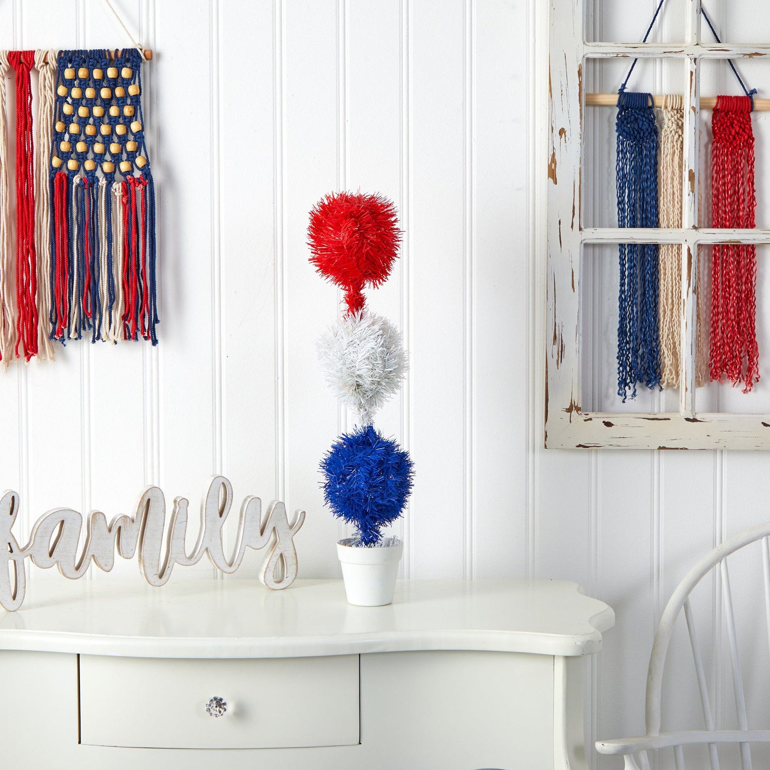 Want to show your love for the flag? Display your patriotic colors with this Americana topiary plant. Three circle topiaries in the colors of the American flag are nestled between 35 warm LED lights. Show support for the brave men and women with this colorful accent that can be displayed year-round or for special holidays such as Memorial Day, 4th of July, or Veterans Day. Standing 2' from a white planter, house in a living room during a party, kids' room, or office, makes a great gift to a member of the armed forces. We guarantee it will be a showstopper. Battery Operated.