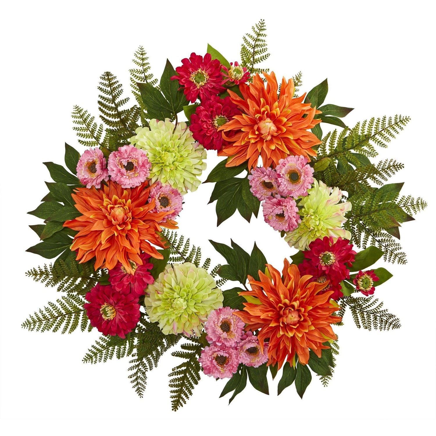 It's hard to determine where to start looking and admiring this artificial mixed floral wreath! With lifelike green foliage and ferns, it comes with yellow, orange, light and dark pink blooms with realistic petals that produce a brilliant burst of color in your room. Place it on the front door or any interior wall in your kitchen or dining room to bring a hint of spring inside. No need to add decor to complement this piece; it'll stand out on its own.