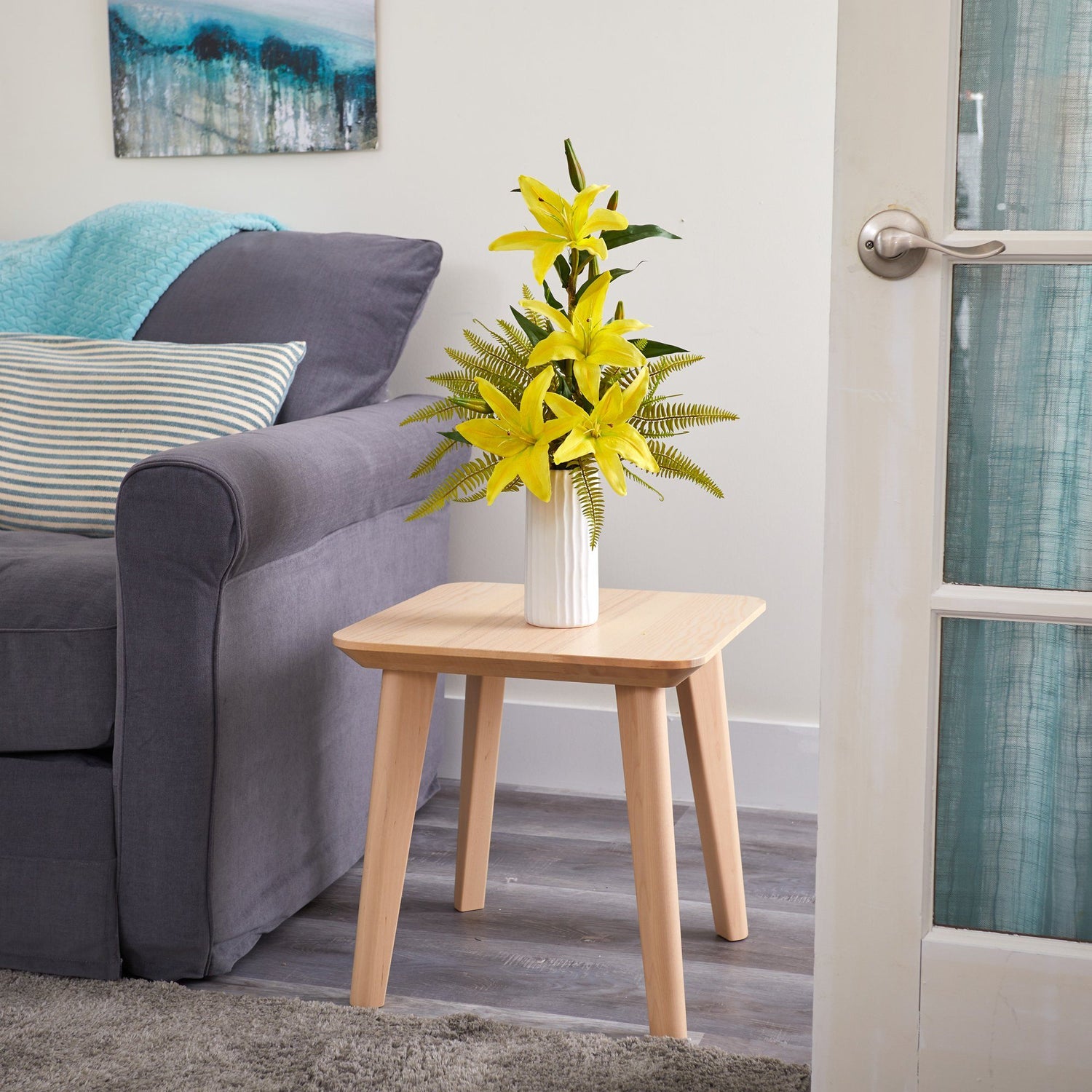 Incorporate bursts of vibrant color throughout your decor scheme with this artificial arrangement boasting a collection of brightly colored silk lilies captured in mid-bloom and designed with realistic qualities; carefully highlighted throughout with an overgrowth of fern foliage in complementary green hues, this evergreen arrangement stands 22” high from a white vase.