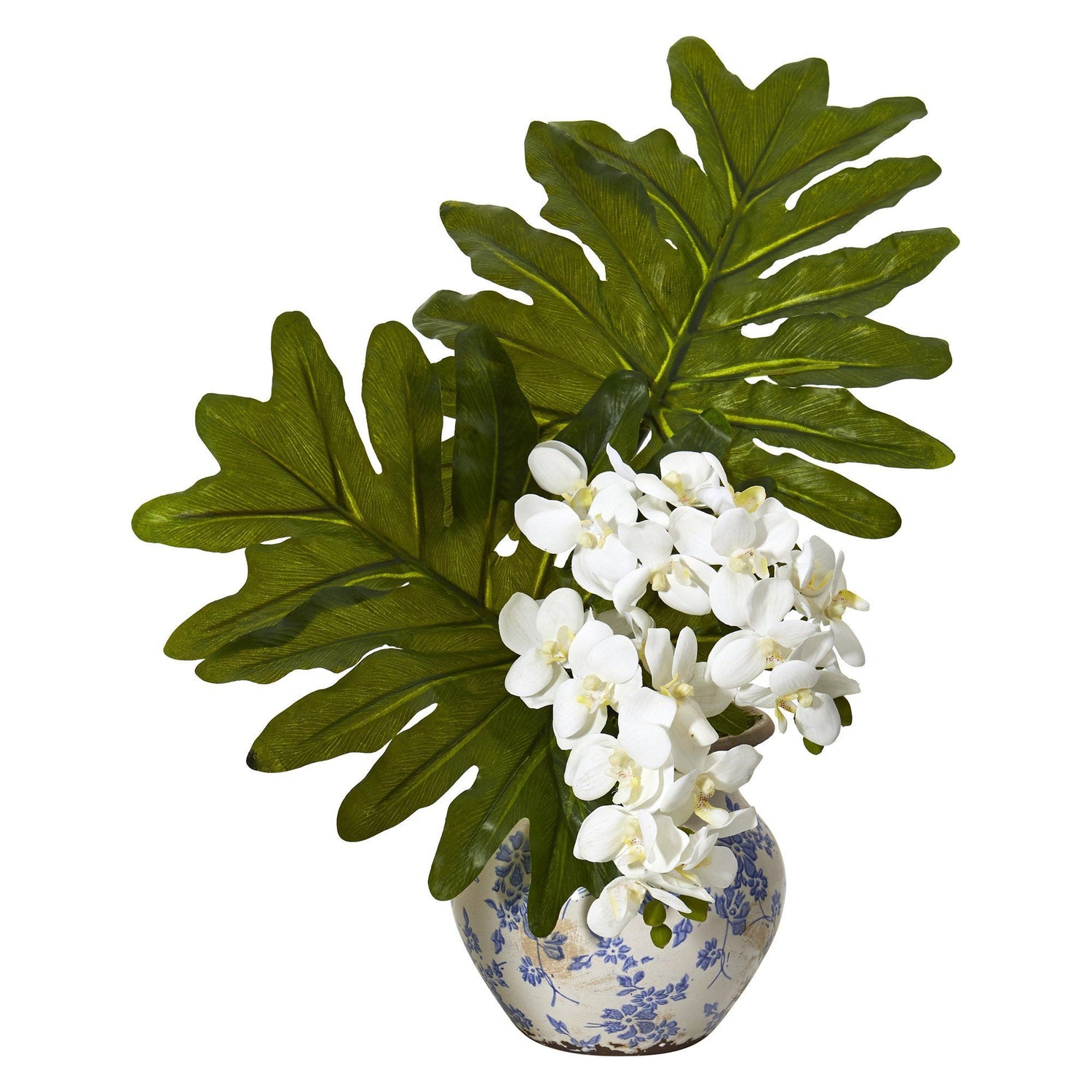 Transport yourself to a tropical oasis with the help of this artificial arrangement boasting a collection of intricately designed phalaenopsis orchids in soft hues, handsomely arranged with complementary philodendron selloum greenery. Standing 22” high from a floral vase, this tropical arrangement would be a great addition to bohemian-inspired decor.