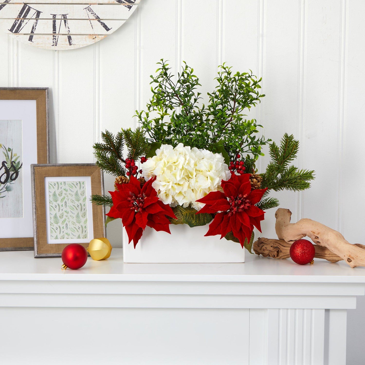 Add seasonal charm to your holiday decor with the help of this artificial arrangement showcasing a mix of realistic pine greenery, complemented at the base with a brightly colored poinsettias in their signature coloring and hydrangea blossoms in a snow-white hue. Accented throughout with realistic looking holly berries, this holiday-inspired arrangement extends 22” wide from a white vase.