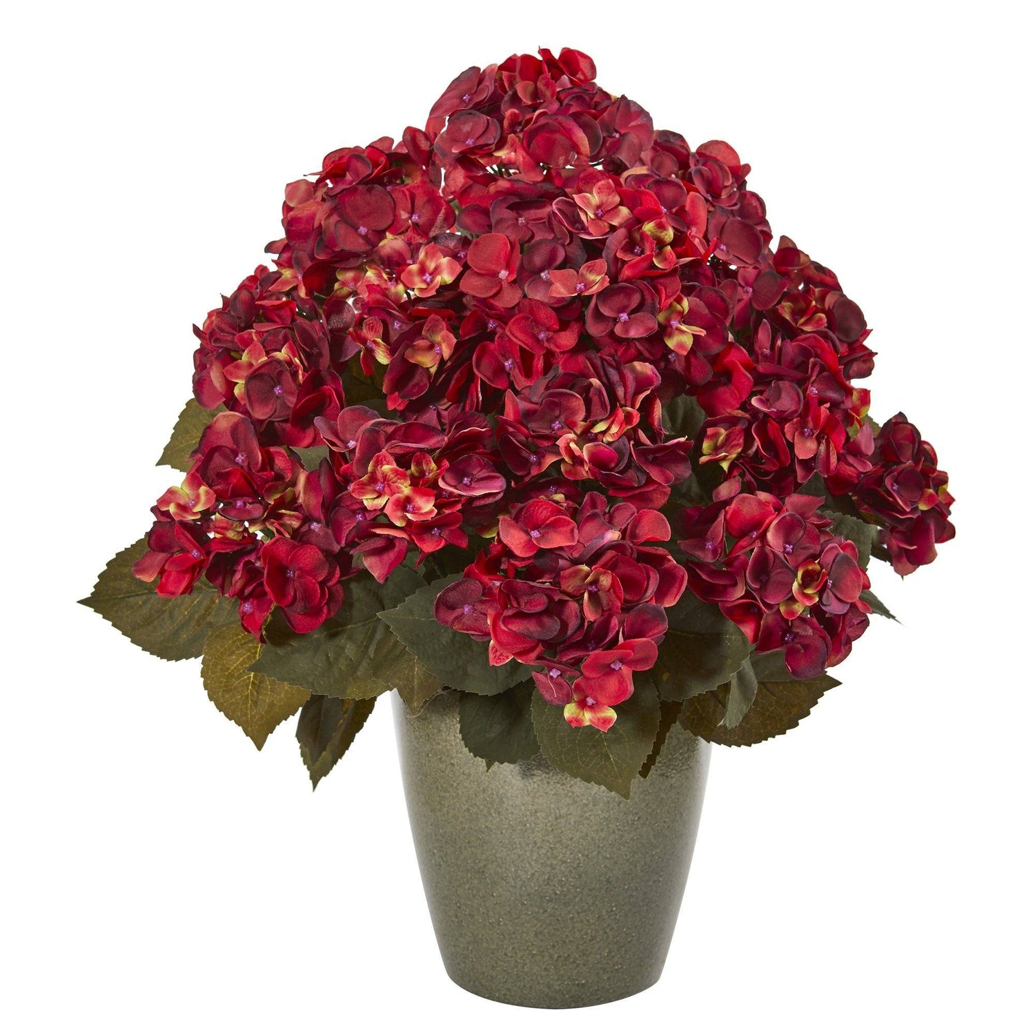 Add a splash of seasonal colors into your decor scheme with this artificial hydrangea plant; flaunting a handsome collection of realistic blossoms in dark, autumn hues highlighted with natural looking leaves peeping out from underneath. Tucked in a green planter for easy mobility, this 23” tall plant would look nice displayed near a home’s entrance.
