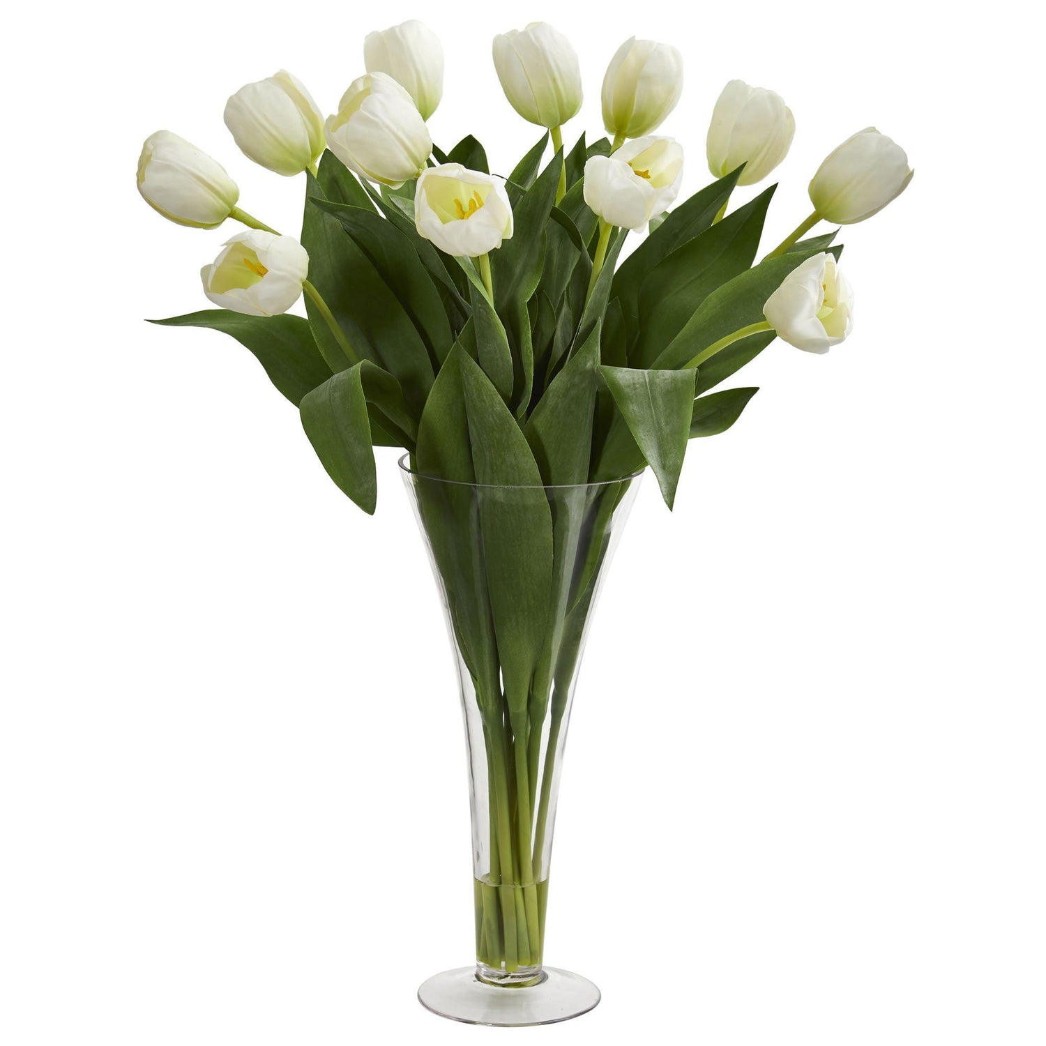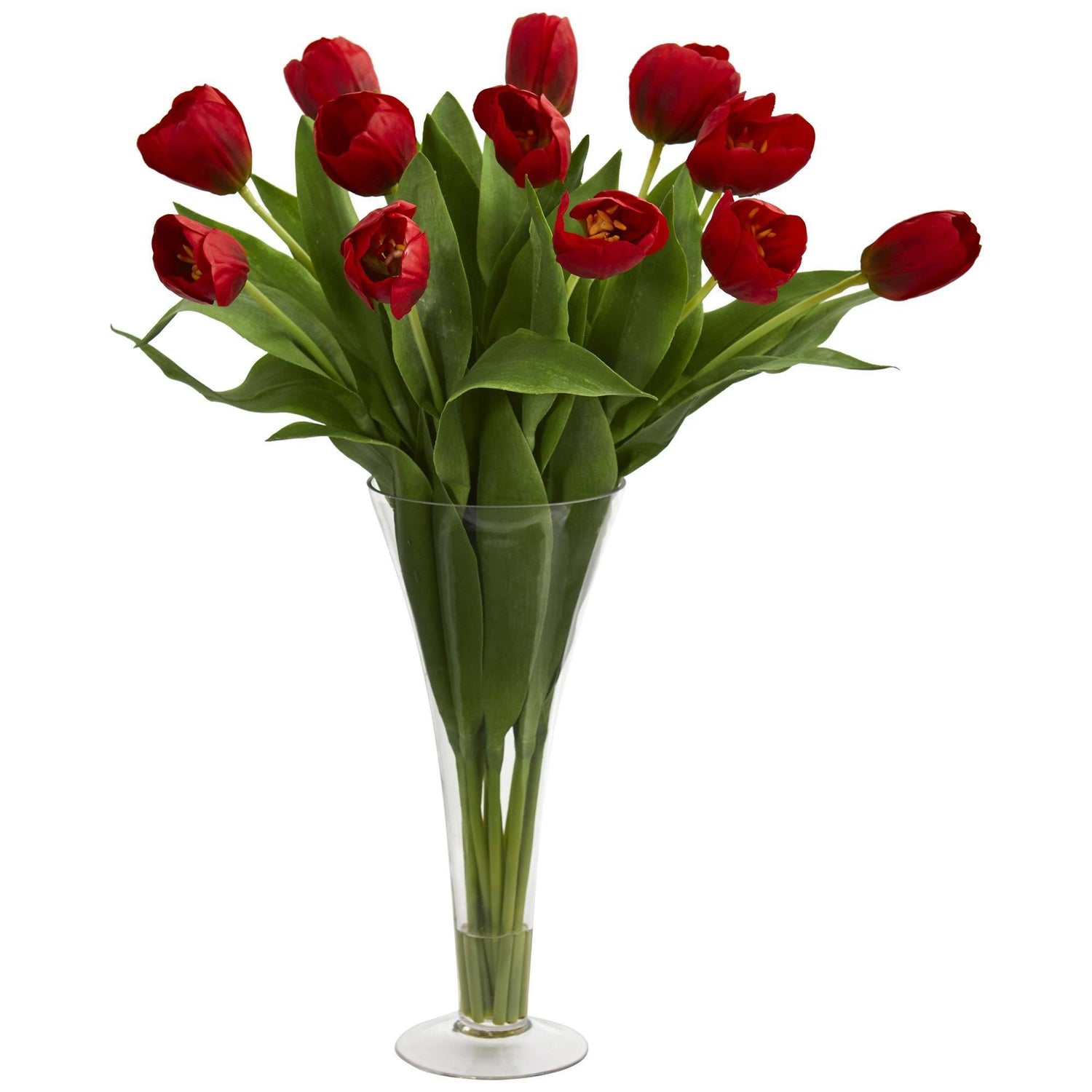 Bring spring and timeless beauty into your home with this artificial tulips arrangement. Perfectly colored tulip blooms fan out of the included flared vase and will add a natural touch to whatever room you place them in. Buy two and place one on your dresser and one on your night stand for a coordinated look.