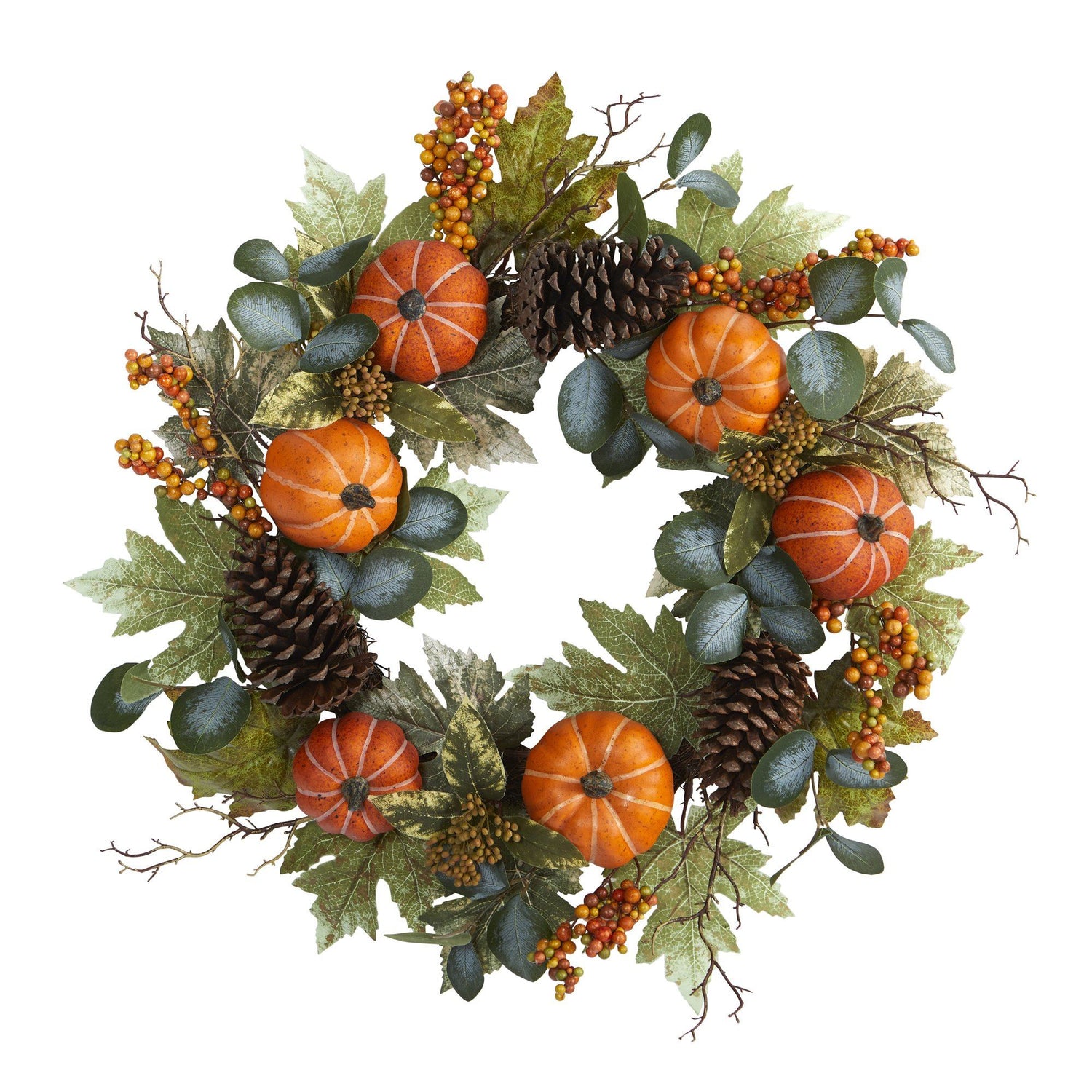 Showcase hues of the harvest with the autumn-inspired beauty provided by this colorful artificial wreath. Intricately designed with realistic looking foliage and dusty evergreens, it comes handsomely accented with faux berries, pinecones, and miniature pumpkins - all of which look incredibly lifelike. Perfect for sprucing up a bare wall or an empty doorway, this 24” (in circumference) decorative wreath would undoubtedly make for an eye-catching accent wherever displayed.