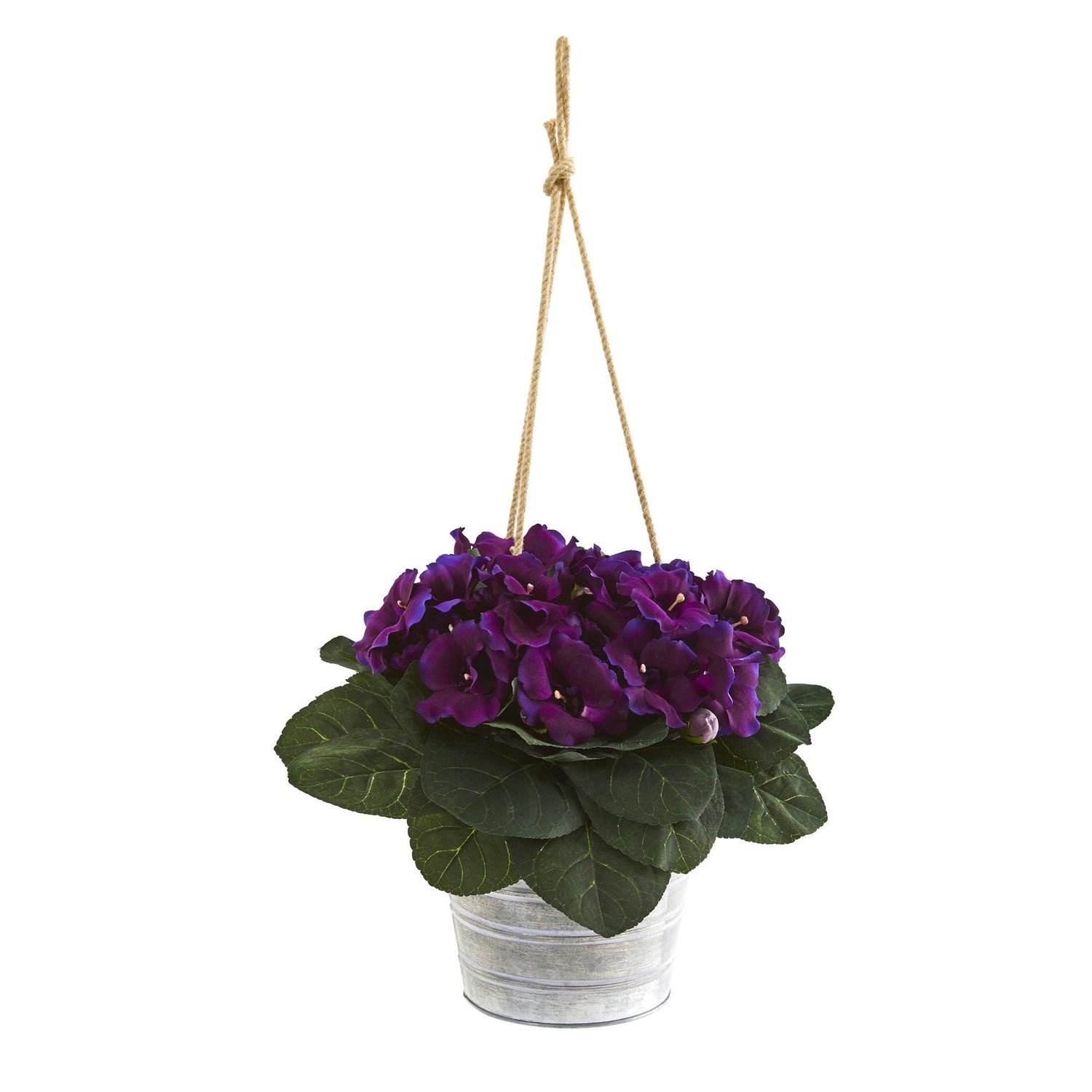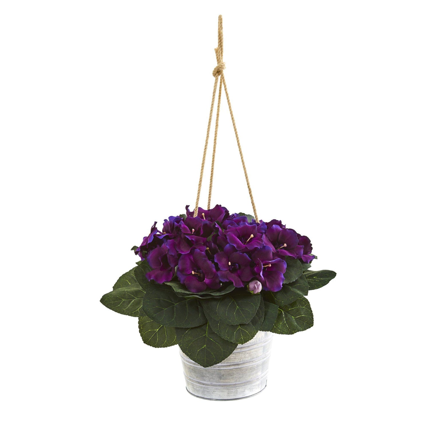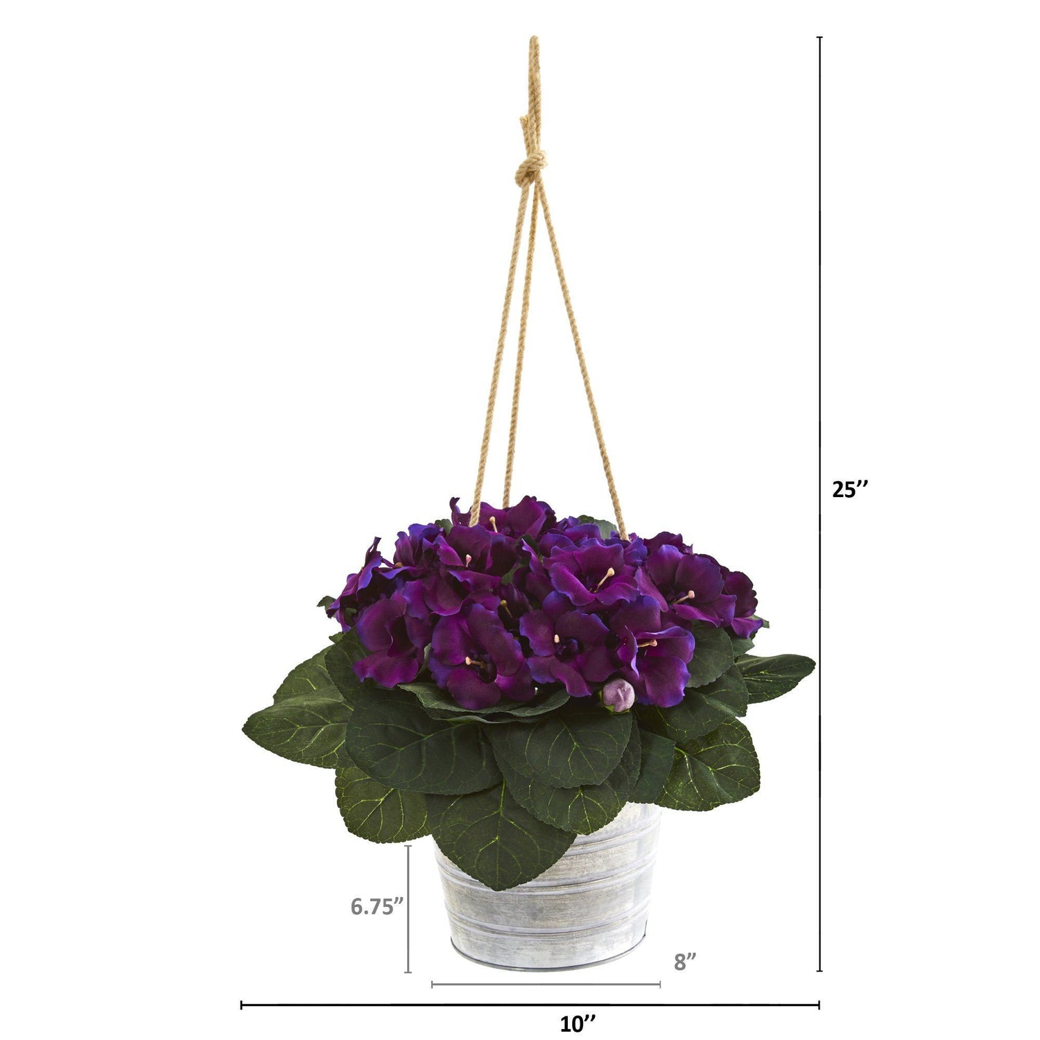 Maximize vertical spaces with the help of this artificial gloxinia plants, featuring a rich collection of dark green foliage highlighted with dark violet blooms showcasing naturally occurring qualities. Reaching 25” long from a hanging metal bucket, this silk plant creates an instant focal point at eye level.