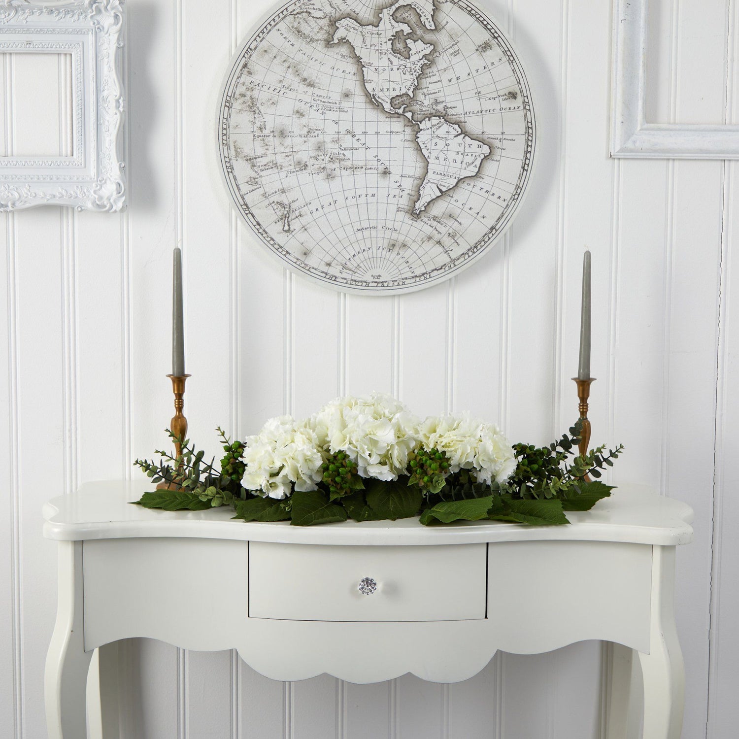 Set the table during the season with this Hydrangea and Eucalyptus Artificial Arrangement. Spread seasonal cheer with this Easter arrangement that you can easily spread in the dining room for a chic picture. The Hydrangea faux flowers bring color while the Eucalyptus brings texture. At 25” wide, place this arrangement in any space that needs some color.
