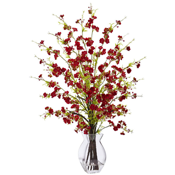 Dainty, colorful petals and simple greenery bloom for springtime color that lasts year-round. Bursting from each stem, Cherry Blossom flowers sit pretty to stand 26" tall. Add depth and height to a room needing more dimension by placing at the dining table, office desk or table side. Includes glass vase
