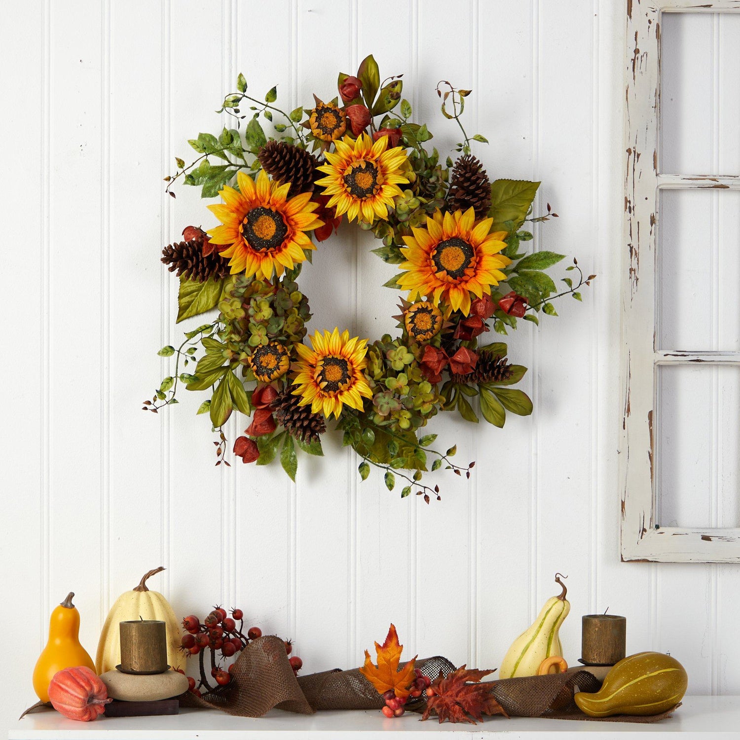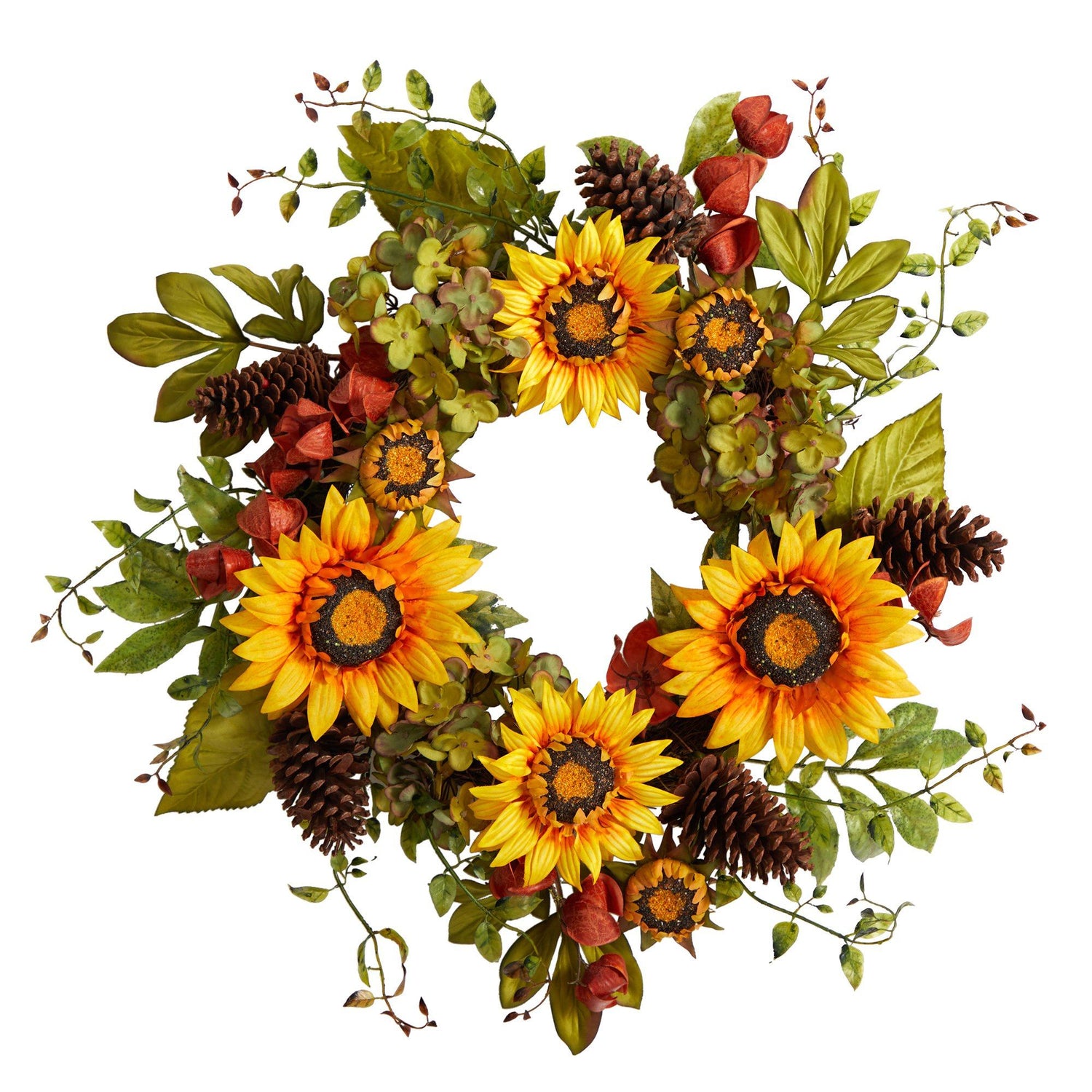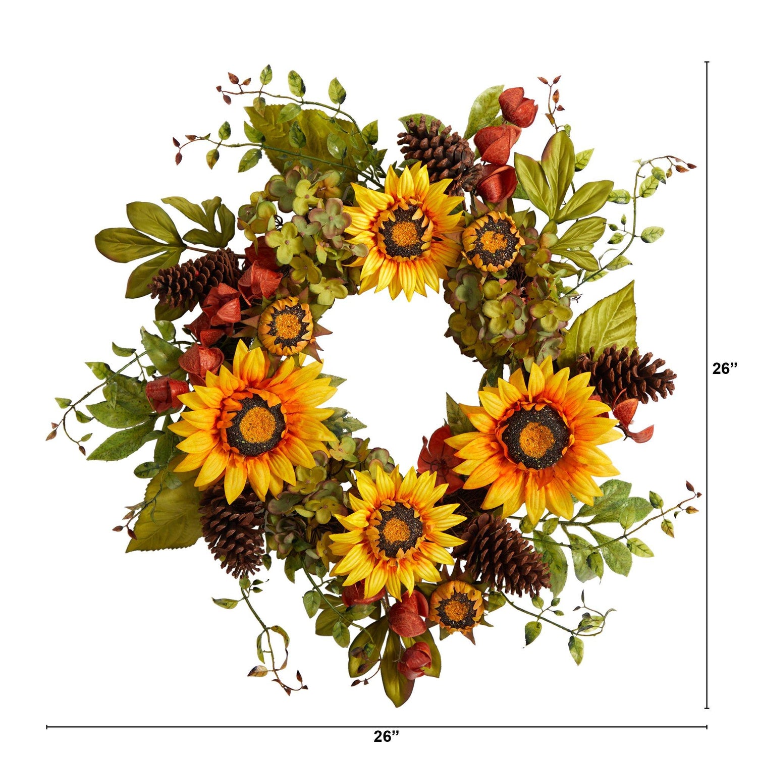 Capture the beauty of fall with this Hydrangea and Pinecones Artificial Wreath. Variegated hydrangeas adorn a green silhouette of leaves, all inspired by the fall foliage. To soften the look and bring a rustic, intimate touch, pinecones add texture while the sunflowers bring an exciting draw to the eye and color. With dimensions of 26", curate this wreath in a bare wall or door. Perfect for the Harvest season and Thanksgiving