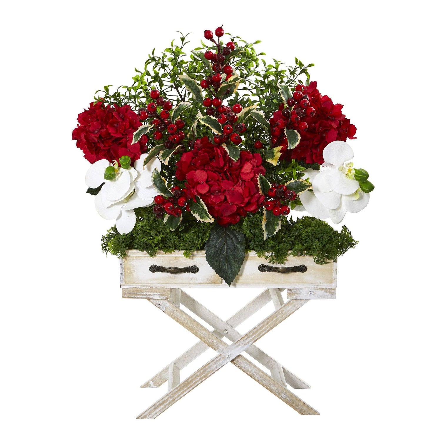 Instantly transform your home into full holiday mode with this artificial arrangement of seasonal favorites; intricately designed hydrangea floral in bright hues softened with phalaenopsis blossoms, complemented with variegated holly greenery and sprinkled throughout with bright red berries. All carefully rooted with natural moss in a drawer planter, this 26” tall silk arrangement would make an exceptional holiday accent.