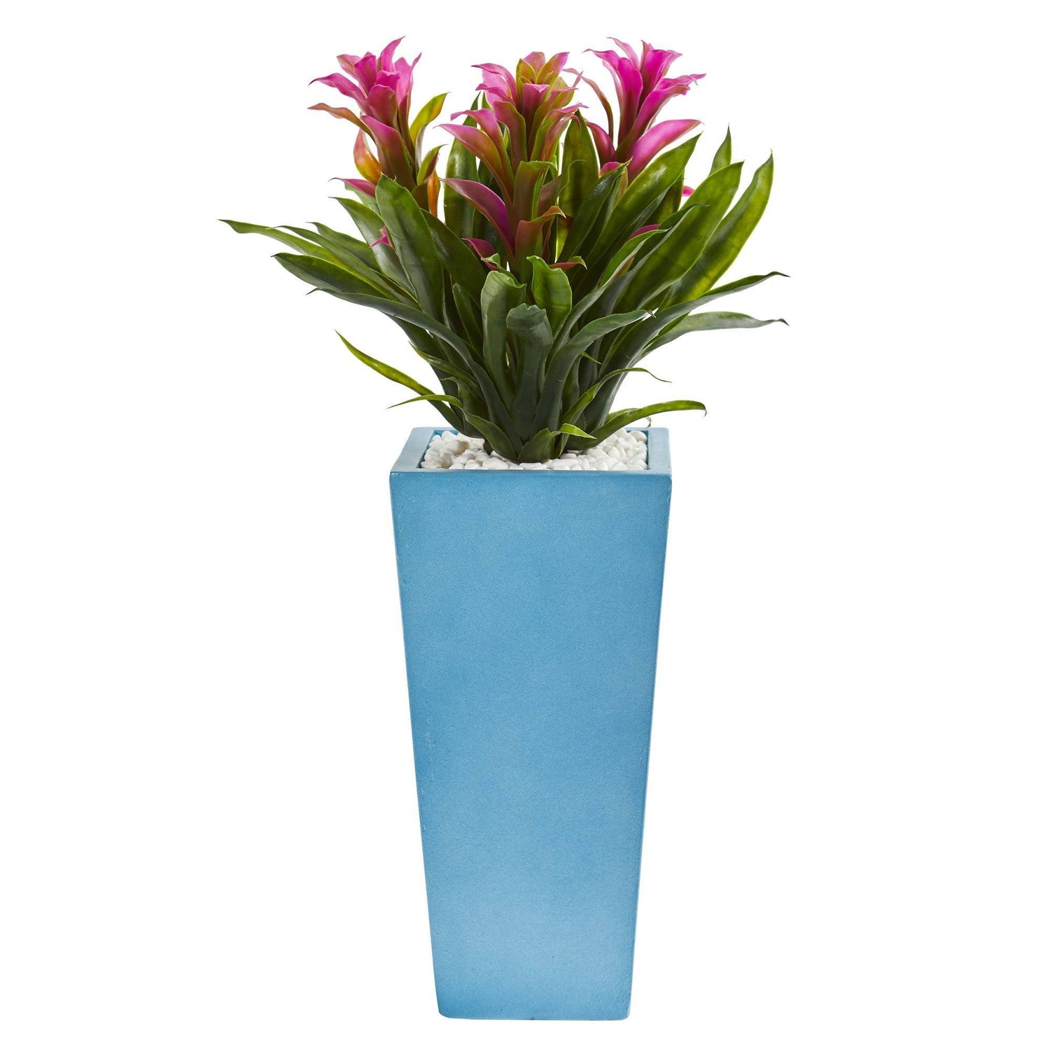 This artificial bromeliad plant's bold bright blooms are sheathed in lifelike green leaves as they shoot upward to bathe in the light. Made with care and very realistic, these tropical blossoms seem to be growing from the included turquoise planter. Place this bromeliad near palm trees and other faux tropical plants for an island-inspired look.