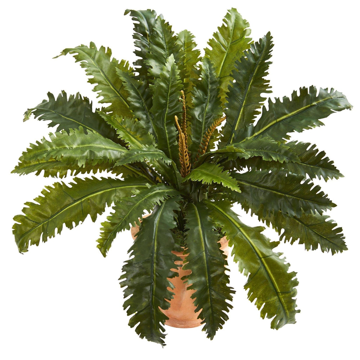 This unique artificial marginatum plant will bring an explosion of nature into your home or workspace. Its elongated, jagged leaves are bursting out of the included terra cotta planter, giving it a wild, jungle-like appeal. The bold appearance of this artificial plant adds drama and excitement to any room it occupies. You can also place it in an entryway or foyer near your potted faux flowering plants to make a fuller and more lush arrangement.