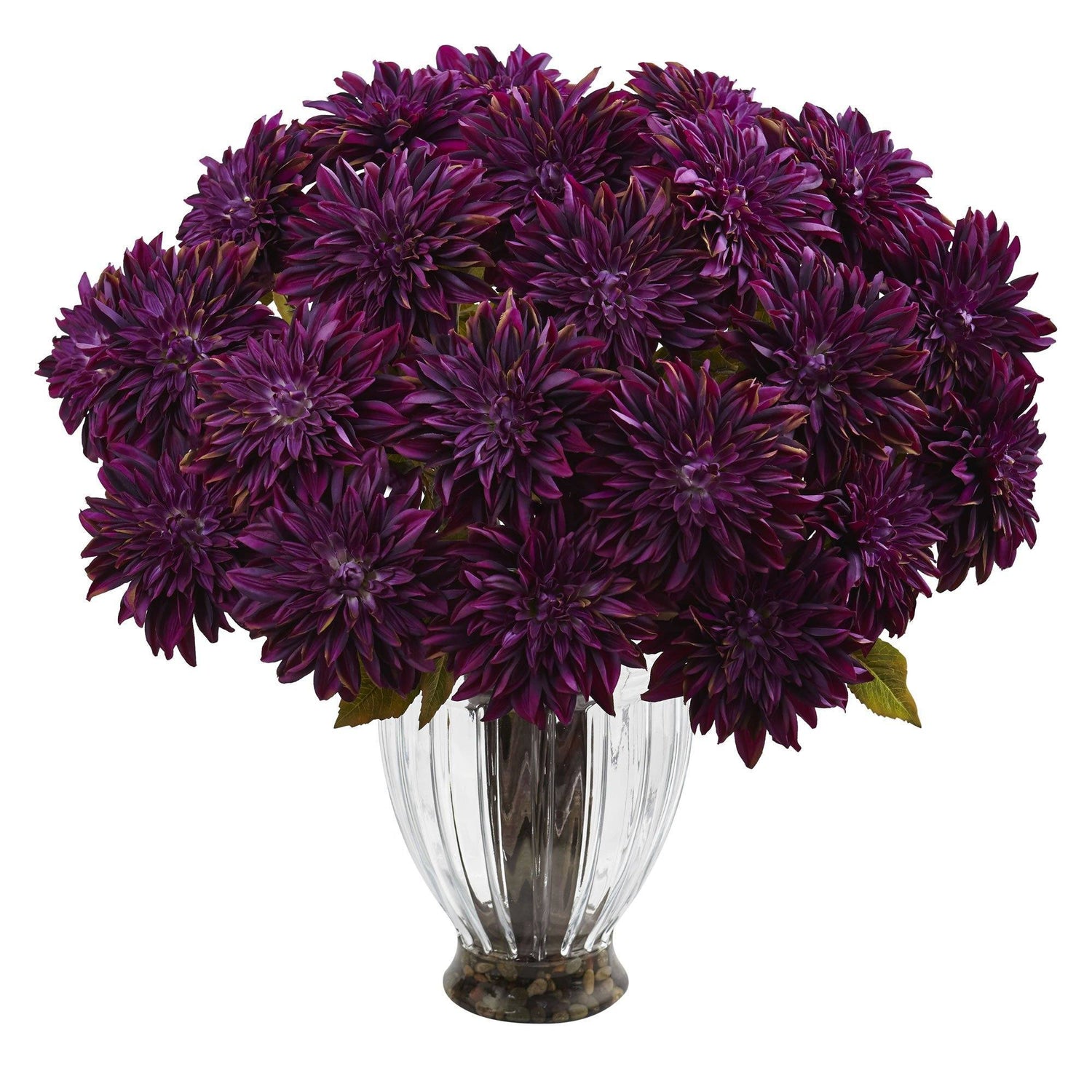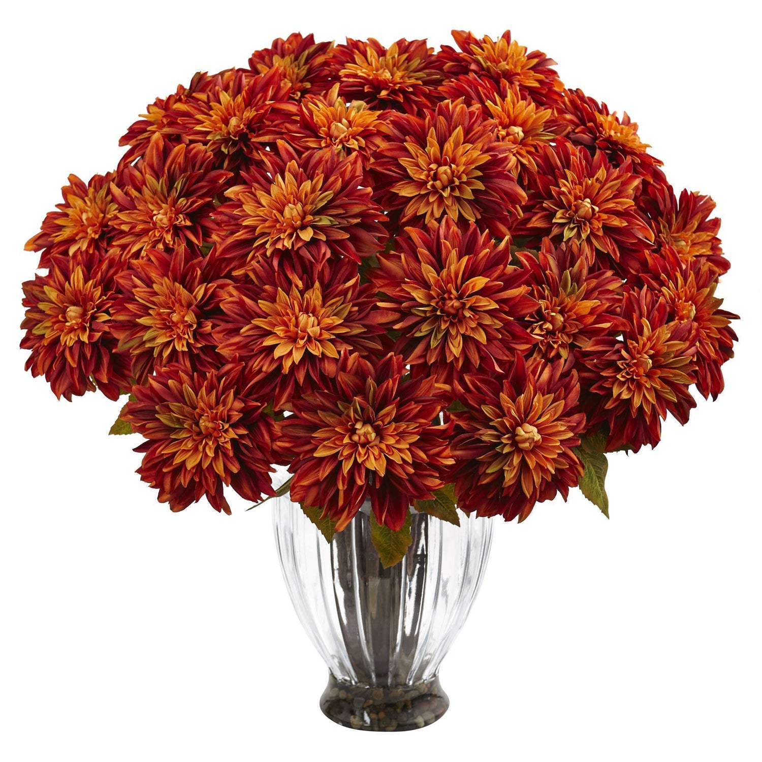 Measuring 27” tall, this arrangement of Dahlias is the perfect lush centerpiece for the dining room or kitchen. With deep, rich hues of color on each petal, this hand crafted arrangement embodies the true Dahlia flower, native to Mexico, and bursting with warm tones of red, yellow, orange and purple.