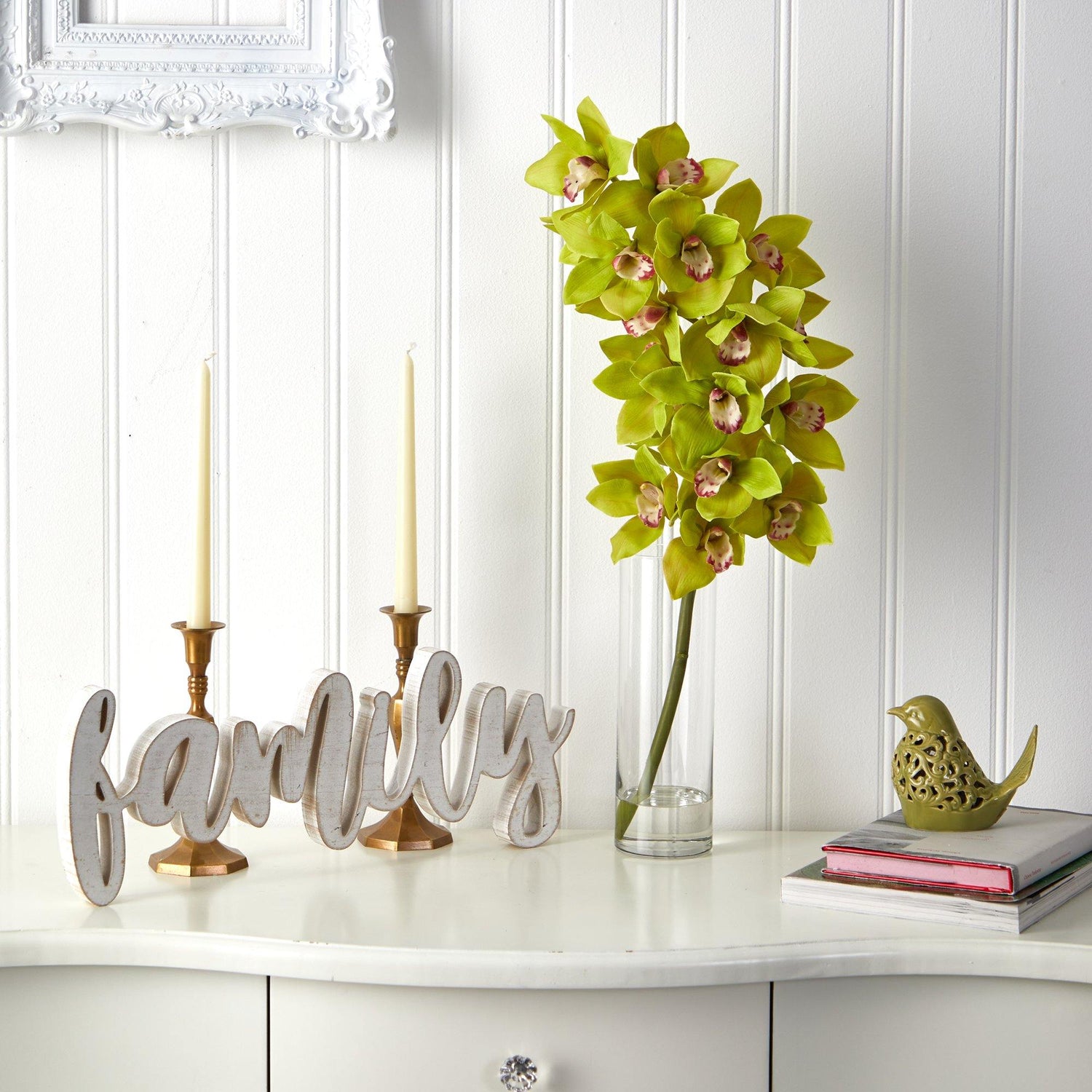 Contemporary yet timeless, this Cymbidium Orchid Artificial Arrangement is sure to find a special place in your home. Large yellowish orchids in bloom with slight variegation are accented by a reddish ombre like center. These realistic looking orchids will last faux ever without the need for maintenance and will instantly bring dimension, style, depth, and color to any space in need of a focal point. Standing 28” from a glass vase with fake water (included in height), curate in areas in need of color. Perfect to place in the middle of a living room table, bedside tables, or kitchens.