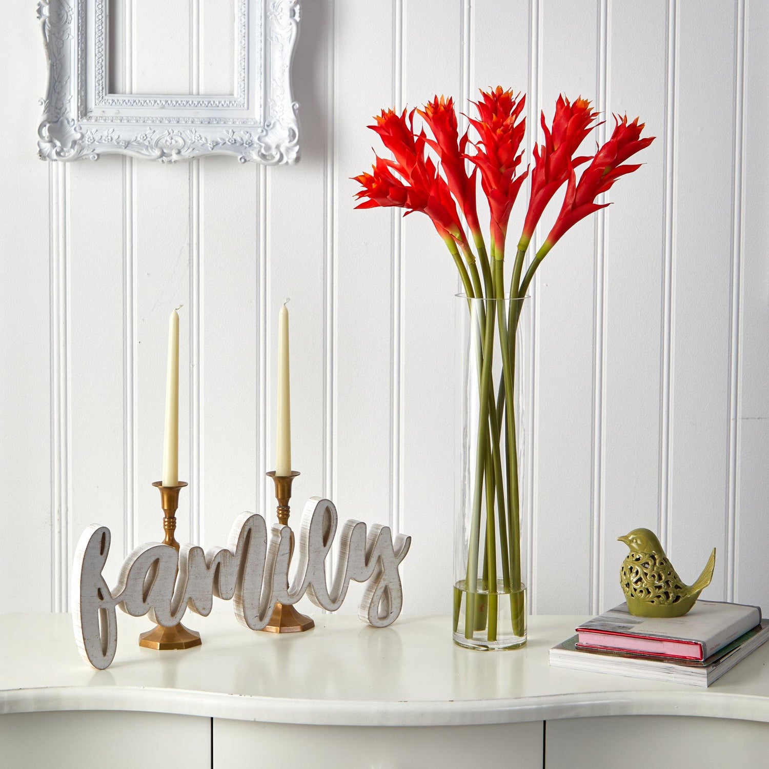 If you love exotic looking flowers, this Star Bromeliad Artificial Arrangement is about to become your friend. Display these sword-like flowers with a unique appearance for a fun addition to any space. Standing 28" from a glass vase with faux water (included in height), curate in spaces that need color. Perfect for areas that need more drama and a focal point. Curate in offices. bedrooms, living rooms or kitchens.