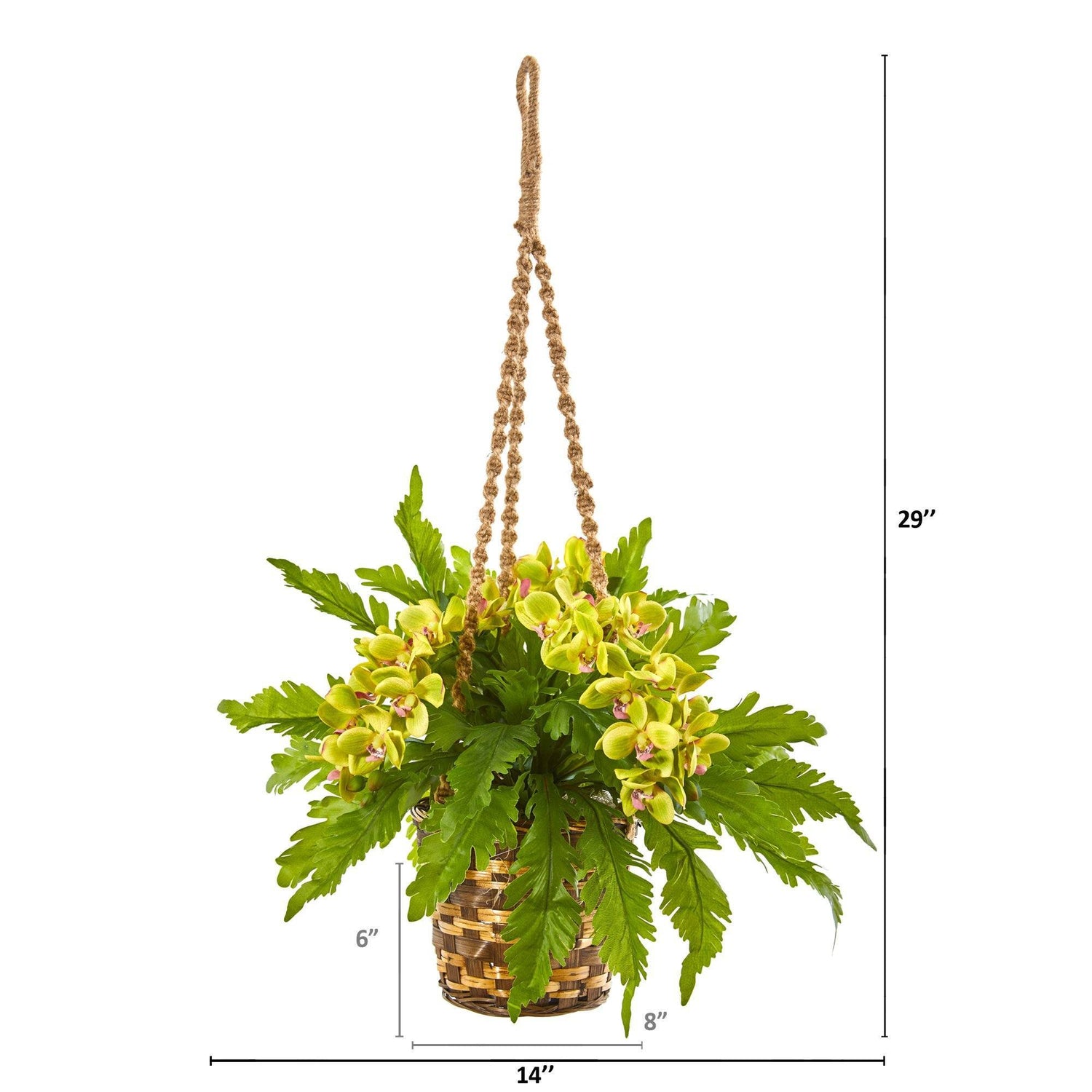 Showcase classic elegance with this artificial arrangement boasting soft, feminine phalaenopsis orchid blooms handsomely contrasted with an overgrowth of realistic fern greenery. Reaching 29” long from a hanging bowl, it’s perfect for maximizing vertical (display) space.