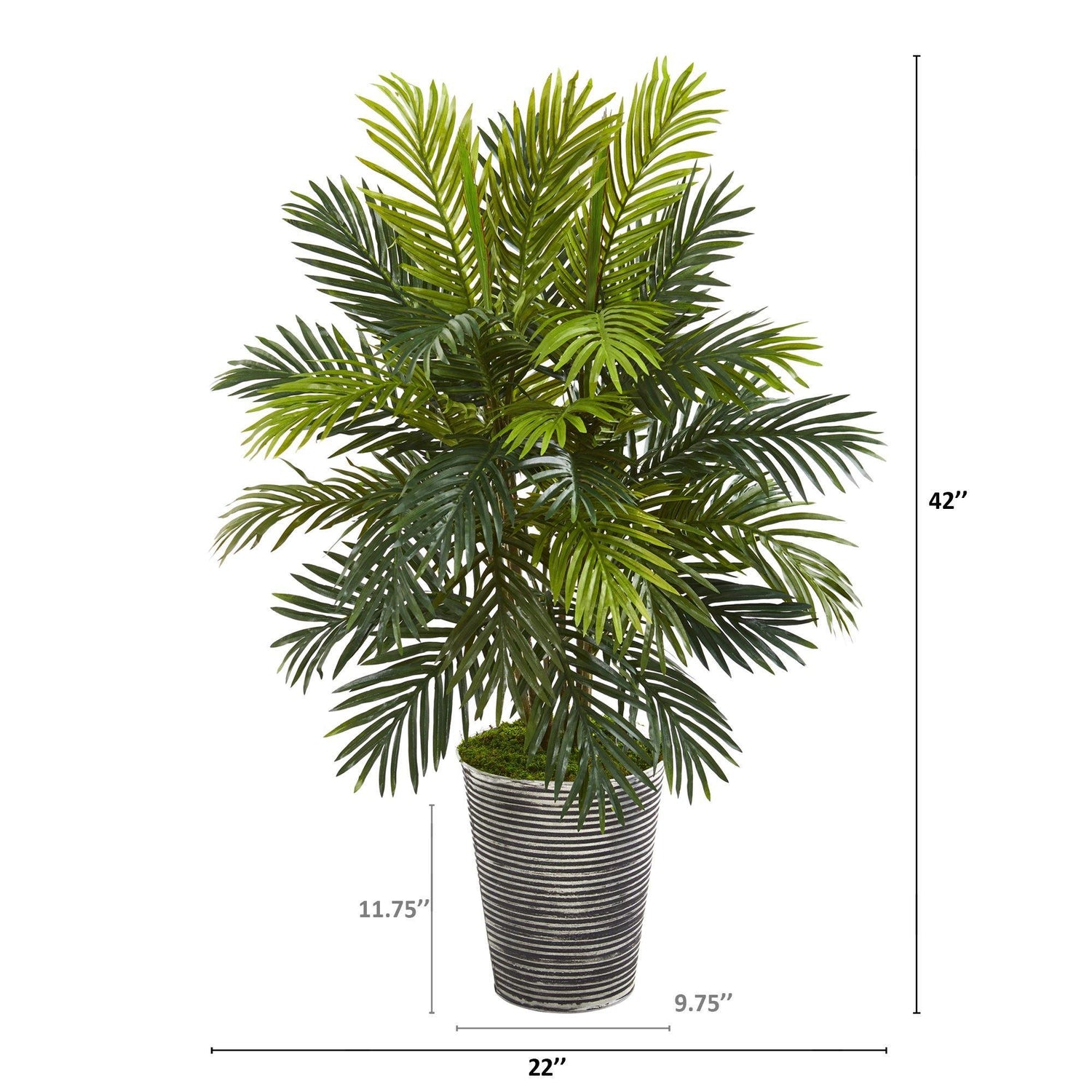 Create a relaxing atmosphere in your home or office with the help of this artificial plant boasting multiple levels of realistic areca palm greenery pouring forth from a tin planter. Standing 3.5’ high and stabilized with natural moss, this impressive fake plant can easily spruce up bare corners all year long - without the need for maintenance.
