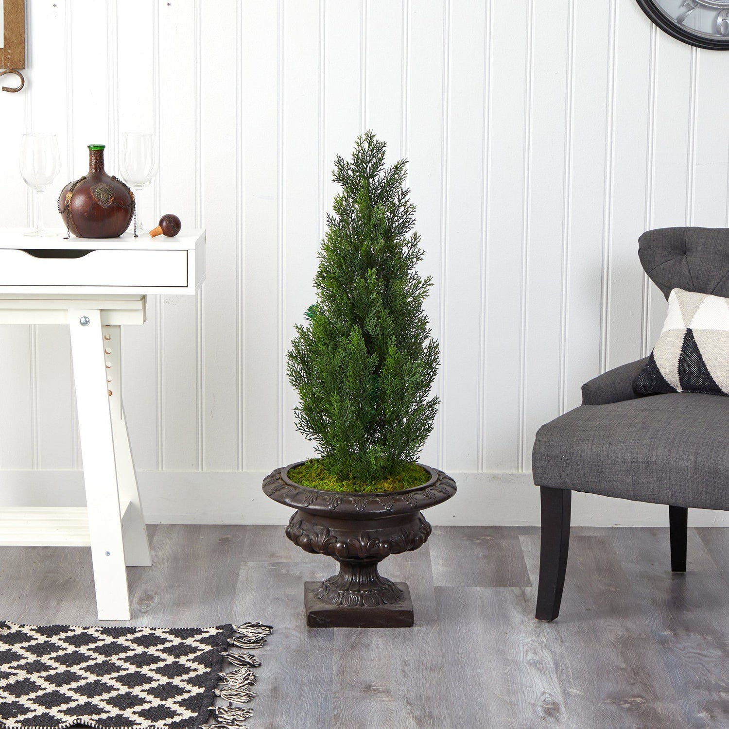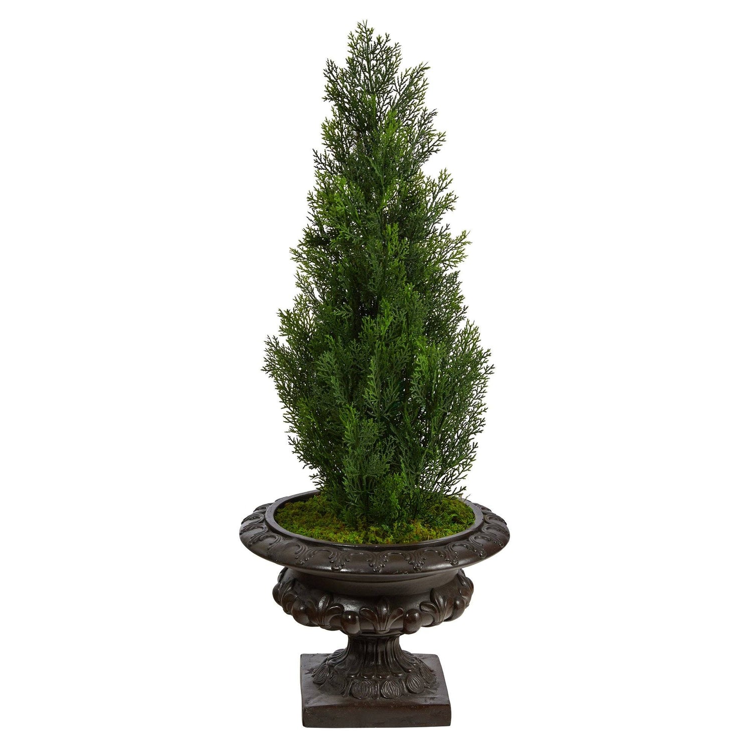 Transform your space into a cozy oasis with this Mini Cedar Artificial Pine Tree. Realistic, well-groomed fronds are shaped into an attractive elongated shape. Standing 3.5' from an iron colored urn, bring the restaurant and European café look. UV resistant, house in any outdoor living area safely. Place in your entryway, foyer, backyard or next to your sofa.