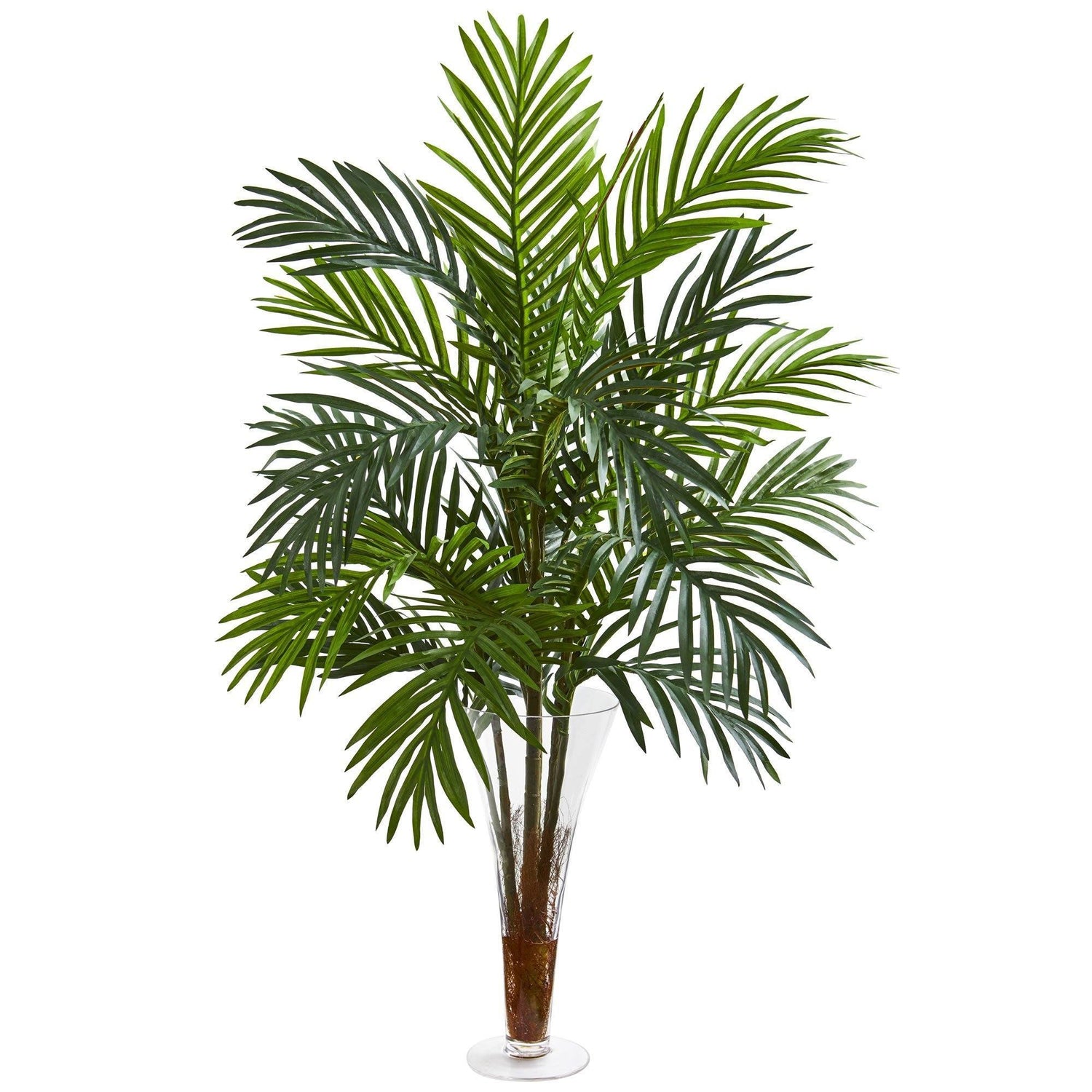 This artificial areca palm features lush green leaves fanning out in different directions and heights from the included flared vase with faux water. With its vibrant coloring, this 3-foot ornament effortlessly exudes a rich, tropical feel. To create a more relaxing ambiance, you can buy two and place them on either side of a low-sitting couch or entertainment system to bring a more natural look to your environment.