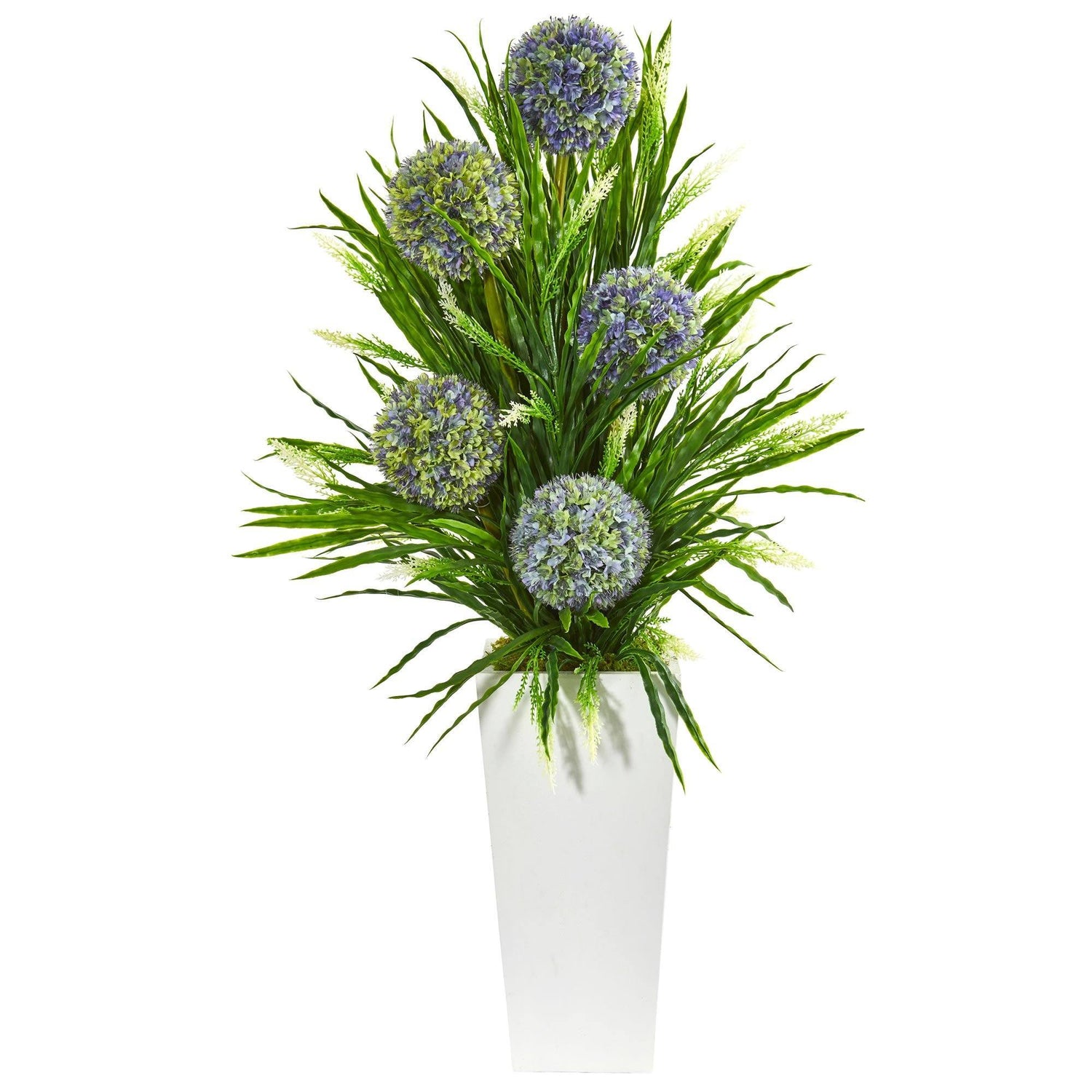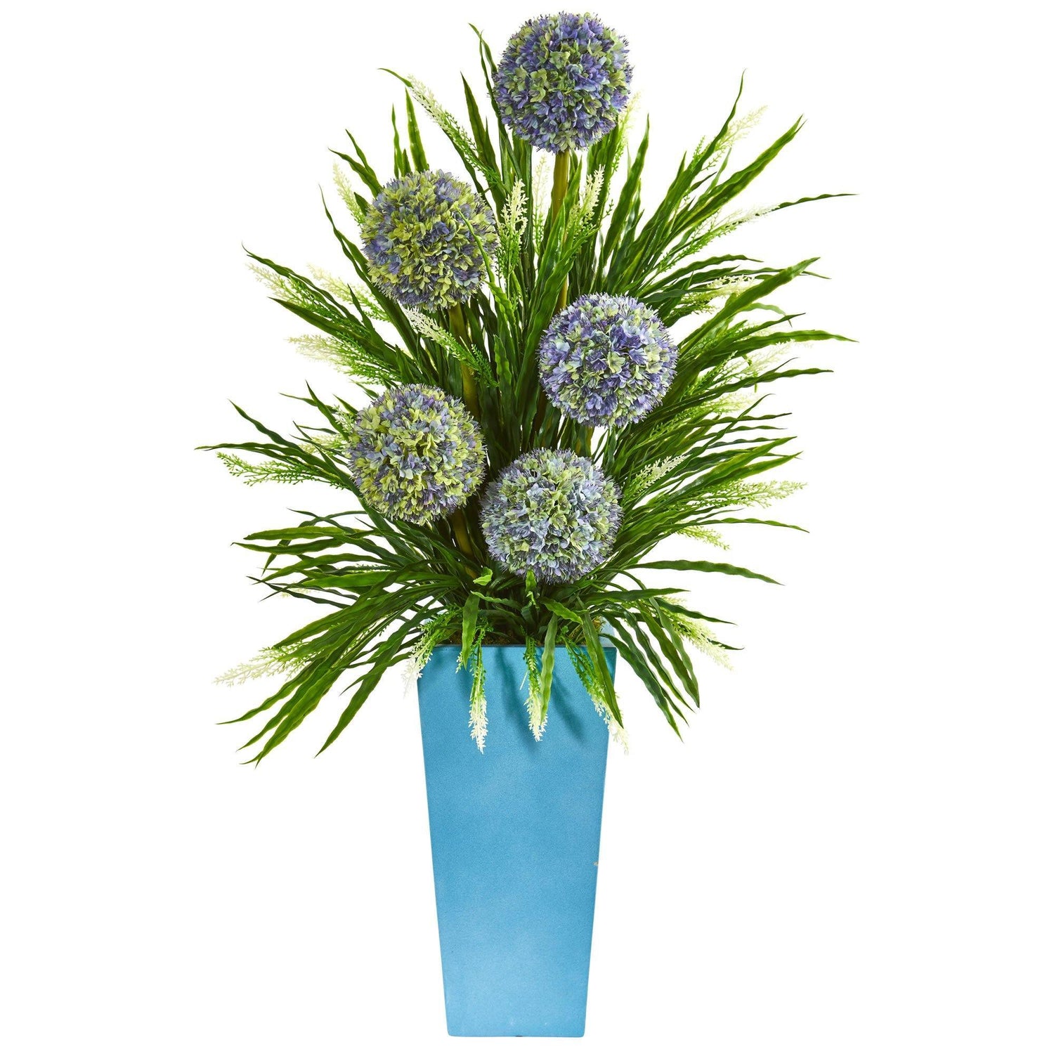 This grass artificial arrangement features five lush, ball-shaped flowers set amongst the long, thin green leaves. Its ball-shaped blooms are light blue with subtle green accents that add more dimension to this ornament. With a fun blue planter included, its beautiful combination will inject a feeling of calm and serenity into your quiet reading nook, study, or den. Position this next to your recliner chair or bean bag, or place it next to your fireplace.