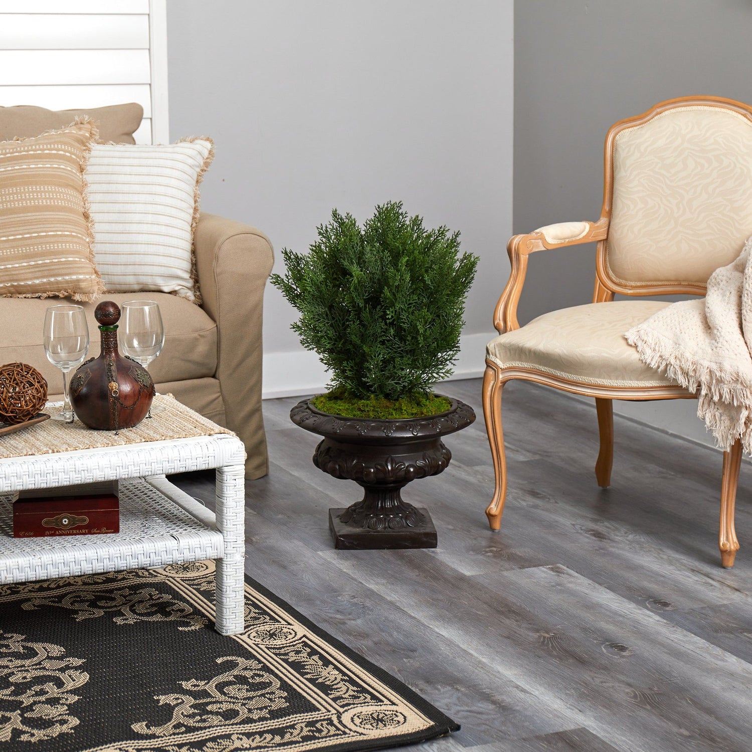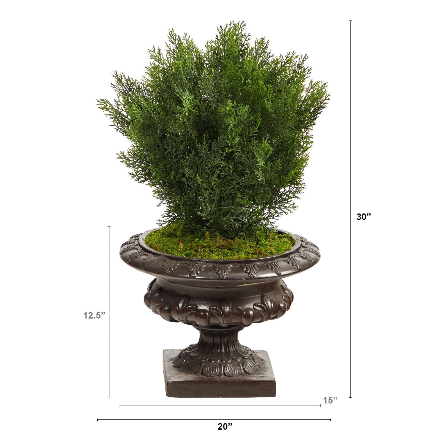 Bring the serenity of the outdoors to your space with this Cedar Artificial Tree. The green, bushy foliage creates a vertical focal point that complements many style decors. Recreate the look of a crisp, morning walk through a western national park. As an added layer of protection this faux tree is UV resistant, place outdoors safely. Standing 30" from an iron colored urn, design in tight spaces that need a little greenery. Perfect for apartments, awkward corners, bedrooms, and foyers.